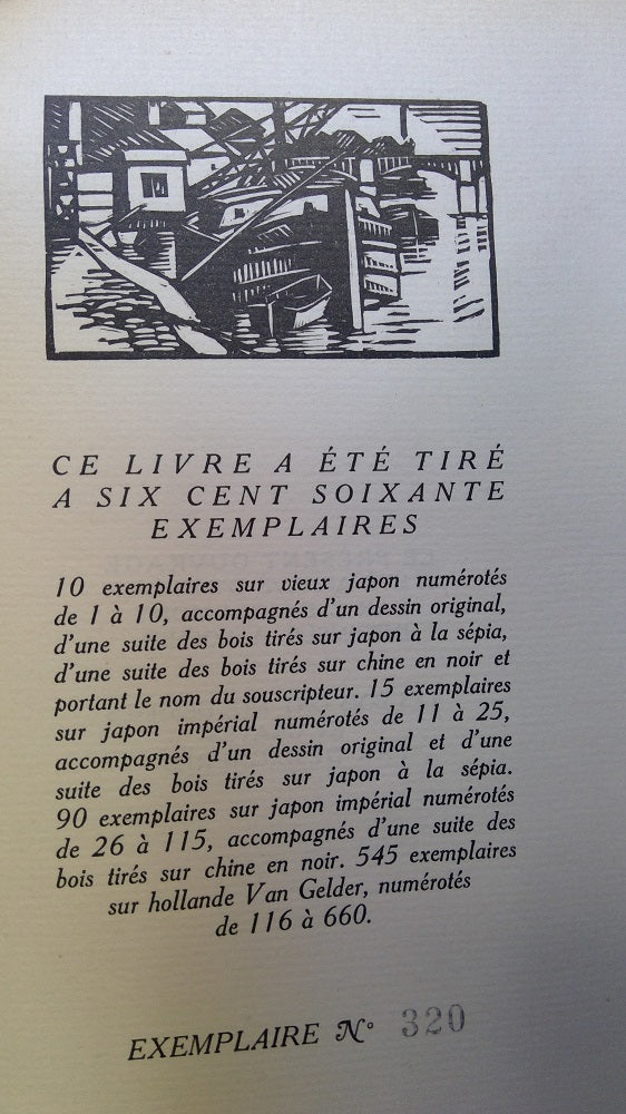 Texte du poète et romancier bourbonnais Charles-Louis Philippe (Cérilly (Allier), 4 août 1874 † Paris, 21 décembre 1909). Avec une préface de l’écrivain paysan bourbonnais Émile Guillaumin (Ygrande (Allier), 10 novembre 1873 † Ygrande, 27 septembre 1951). Illustré de trente-deux bois originaux dessinés par le graveur nivernais André Deslignères (Nevers (Nièvre), 25 septembre 1880 † Marines (Val-d'Oise), 18 décembre 1968 )dont dix à pleine page. Tirage limité à 660 exemplaires (le nôtre, n°320 sur papier de Hollande Van Gelder, enrichi d’un-ex-libris rouge collé de la bibliothèque du docteur Lucien-Graux). Paris, Chez André Coq 1921. 161 p. Grand in-8 broché. TBE.