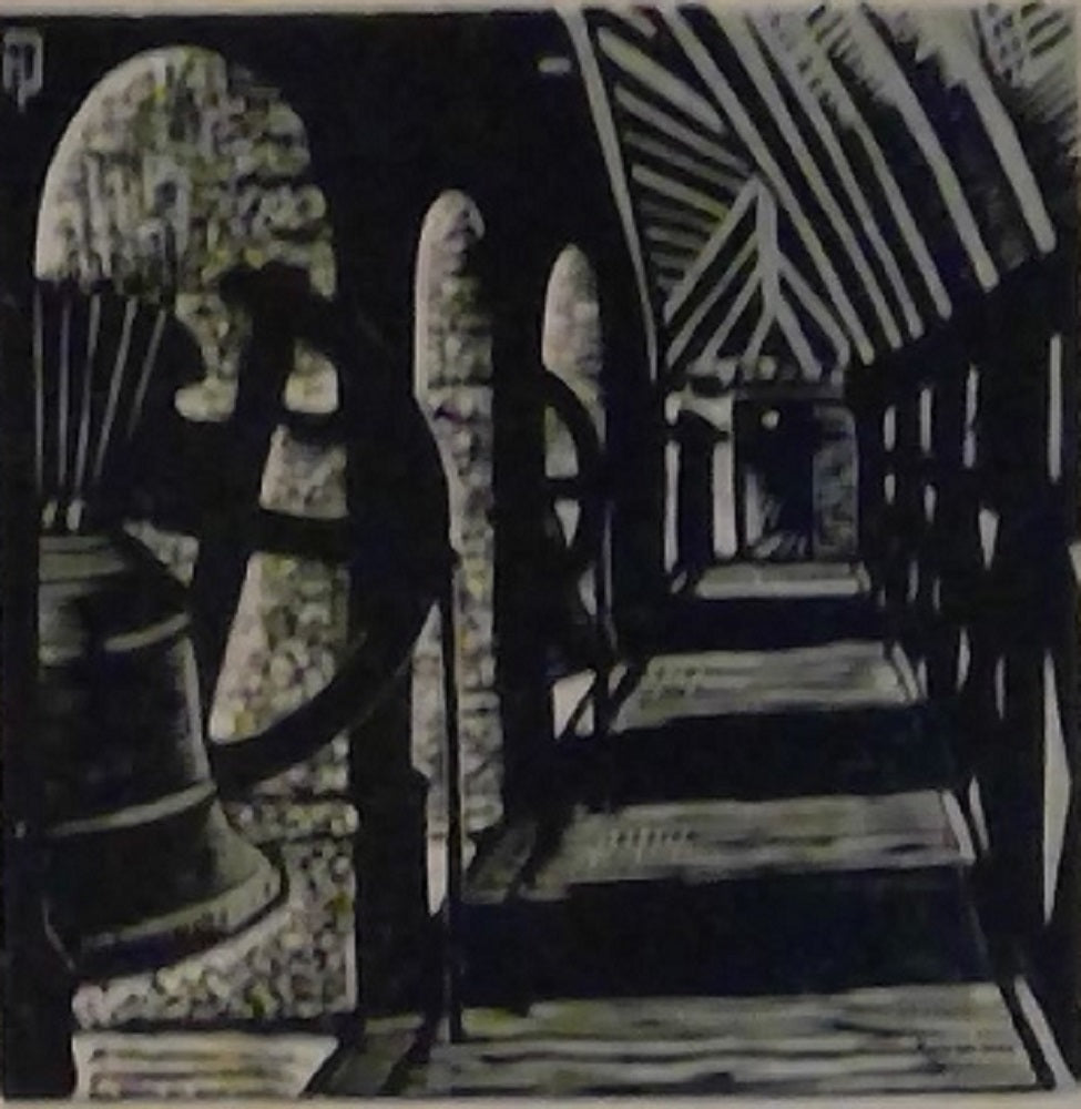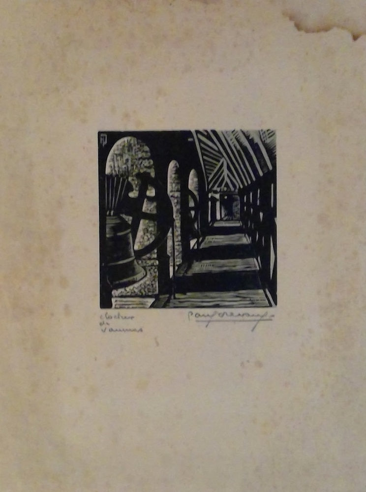 Gravure sur bois originale de Paul Devaux dit Jean Chapouteux (Bellerive-sur-Allier, 28 mai 1894 † Vichy, 25 mars 1949) tirée en noir sur vélin, monogrammée PD dans la planche en hd (avec le P à rebours), et contresignée au crayon sous le sujet à droite. Au crayon, sous le Trait Carré à gauche clocher de | Vaumas à droite Paul Devaux. Hist. : Une des 4 vues du clocher roman réalisées par Paul Devaux, la seule prise de l’intérieur du clocher. Bibl. : Pouradié, p. 64. Notre épreuve : insolée, tâche d’humidité en haut à droite de la feuille sans atteinte au sujet. La feuille h. 281*209 mm, au TC 100*100 mm.