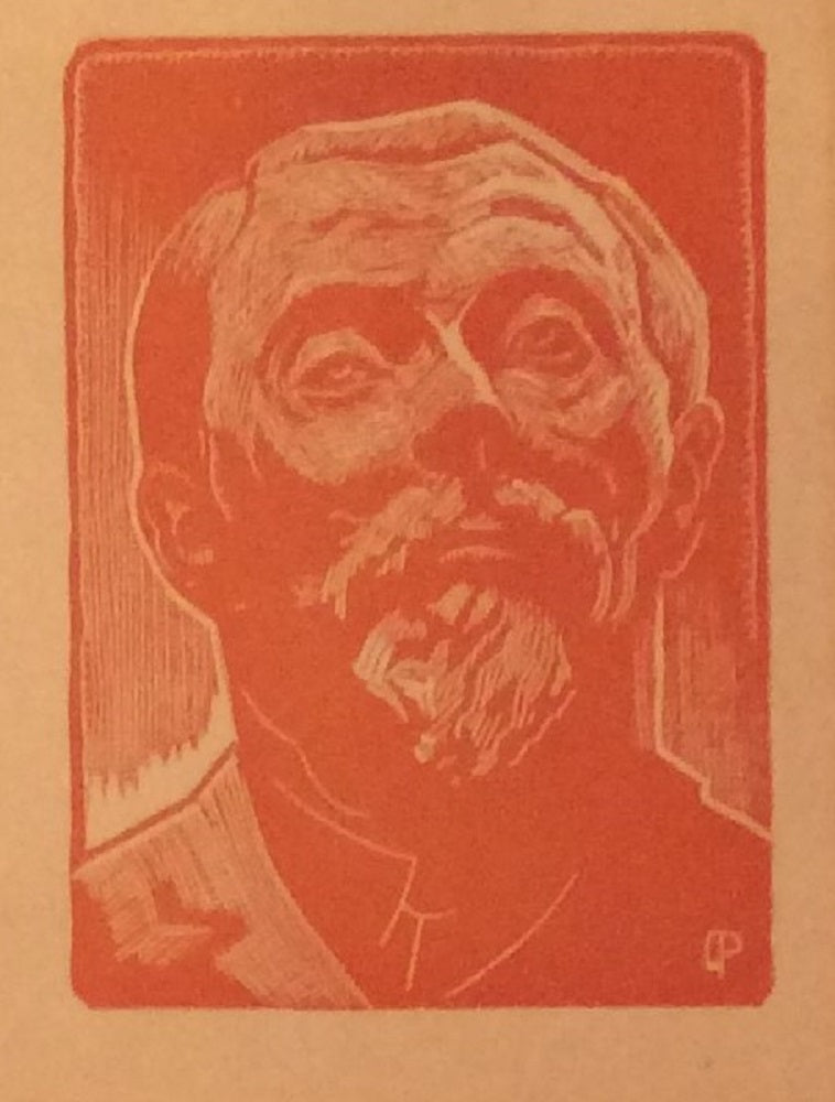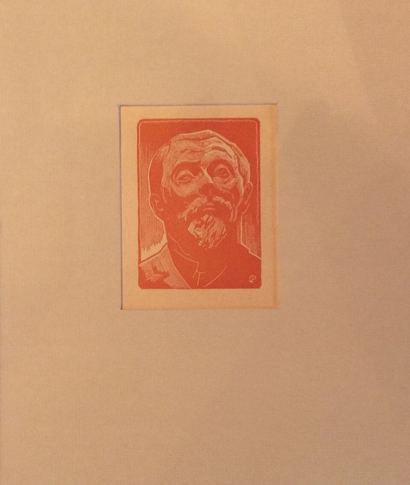 Gravure sur Bois de Paul Devaux dit Jean Chapouteux (Bellerive-sur-Allier, 28 mai 1894 † Vichy, 25 mars 1949) d’après Émile Antoine Bourdelle (Montauban (Tarn-et-Garonne), 29 octobre 1861 † Le Vésinet (Yvelines), 1er octobre 1929) tirée en rouge, sur vélin. Sujet : gravure d'après la sculpture fondue en 1911 par Alexis Rudier pour le monument dédié à l’écrivain et poète bourbonnais Charles-Louis PHILIPPE (Cérilly (Allier), 4 août 1874 † Paris, 21 décembre 1909). Monogrammée pd dans la sujet en bd (avec le « p » à rebours ; En bg de la feuille, impression typographique CHARLES LOUIS PHILIPPE | esquisse directe sur bois de | Paul Devaux | d’après la sculpture de Bourdelle . Dim. la feuille 247*160 mm, le sujet 96*70 mm.