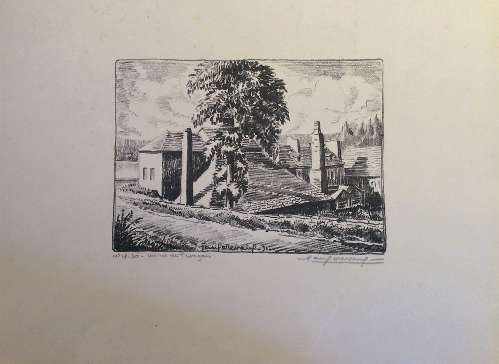 Estampe par le graveur sur bois Paul Devaux dit Jean Chapouteux (Bellerive-sur-Allier, 28 mai 1894 † Vichy, 25 mars 1949), SDb au centre, sous le sujet, au crayon, à g justifiée n°17/30 et titrée Usine de Tronçais, à d contresignée. Représentation des forges de Morat dans la forêt de Tronçais (Allier). Belle épreuve, grandes marges malgré une pliure dans la marge inférieure. La feuille 263*338 mm, le sujet 130*184 mm.