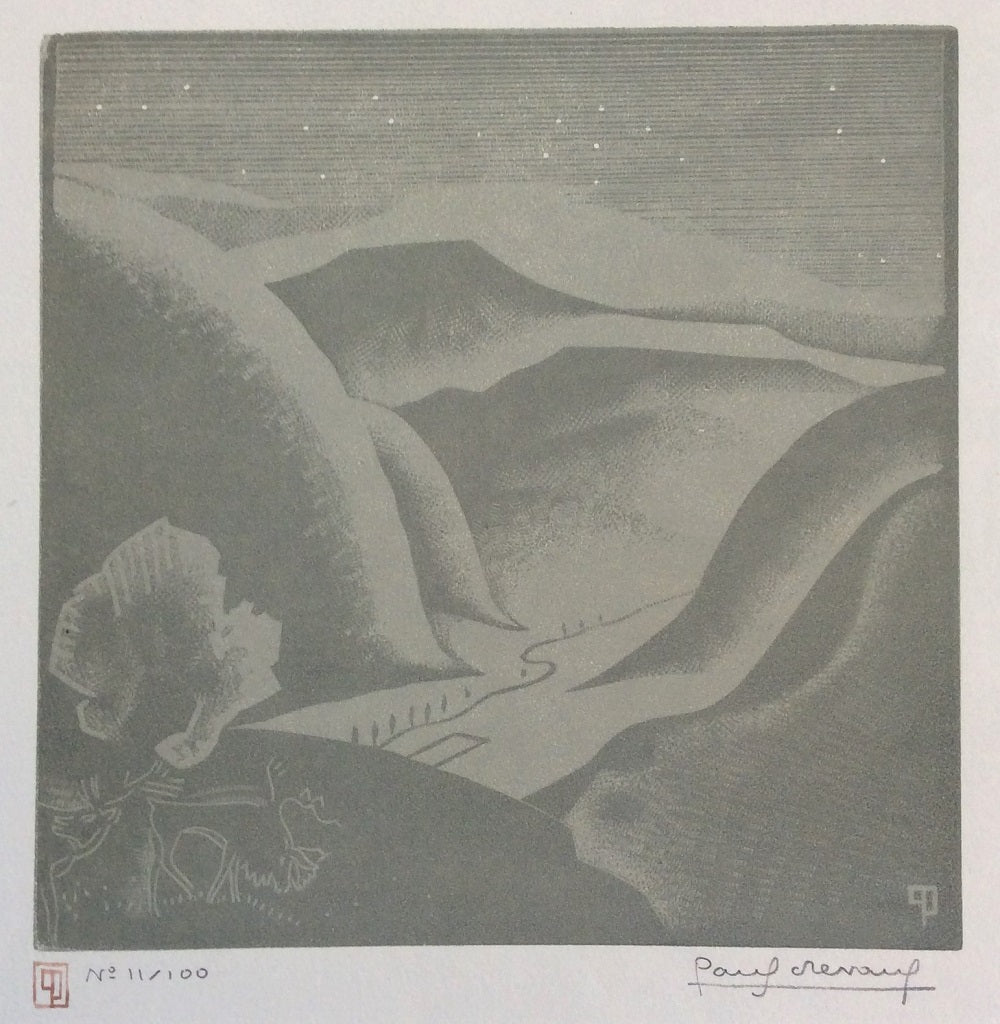 Estampe par le graveur sur bois bourbonnais Paul Devaux dit Jean Chapouteux « tailleu d'images à Vesse » (Bellerive-sur-Allier (Allier), 28 mai 1894 † Vichy, 25 mars 1949)près Vichy pour Vichy 10 gravures originales. Monogrammée dans la planche en bd ; sous le sujet à gauche cachet à l'encre verte PD (avec le P à rebours) et au crayon, d'une écriture cunéiforme, justifiée 75/100 et signée à droite Paul Devaux en bg titrée Les Champs | Glozeliens. Une des planches de l'album Vichy 10 gravures originales tiré à 100 ex. en 1928. Représentation des ruines préhistoriques (alignement des pierres, motifs ornant les ossements) trouvées à Glozel dans la montagne bourbonnais près de Vichy (Allier) par Émile Fradin. En savoir plus.