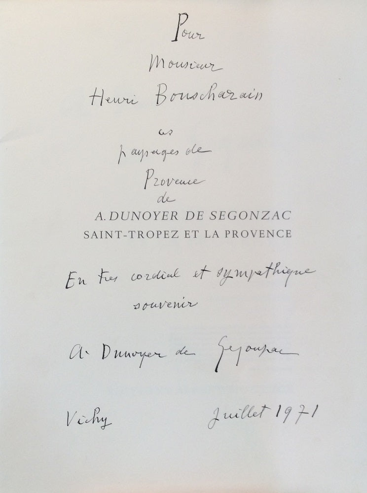 Gravure en Noir et Blanc pour l’ouvrage préfacé par Max-Pol Fouchet A. Dunoyer de Segonzac Saint-Tropez et la Provence (ditions Albert Morancé, 1964, n°689/1000). Ouvrage complet de ses 32 planches en noir et en couleur, et de la gravure sus citée, enrichi d’un envoi sur la page de titre Pour | Monsieur | Henri Bouscharain | un | paysage de | Provence | de [titre de l’ouvrage] | En très cordial et sympathique | souvenir | [signature] | Vichy juillet 1971. Folios libres sous jaquette entoilée d’éditeur avec rabat. TBE. 390*295 mm.