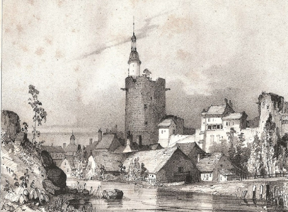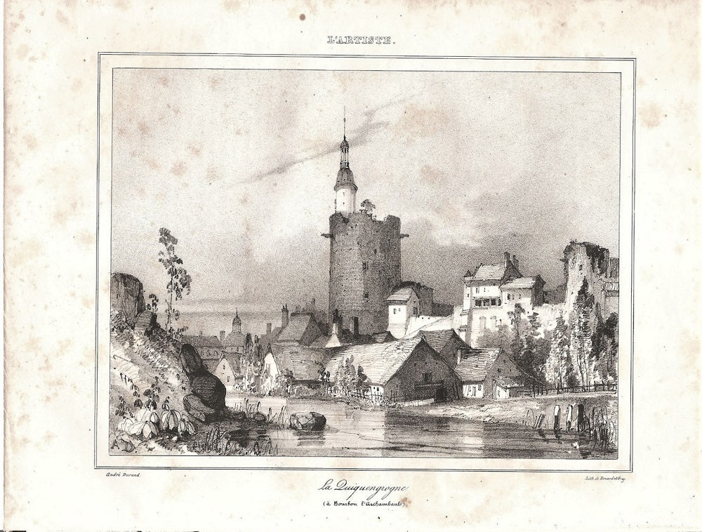 Estampe/Lithographie originale par André Durand (Amfreville-la-Mivoie (Seine-Maritime, Haute-Normandie), 5 mai 1807 † Paris, 10 août 1867) pour L’Artiste (Vol.11, 20e livr) tirée par Bernard et Frey. Monogrammée en bg dans la planche A. D. Vue de cette célèbre tour du château des ducs de Bourbon dans la citée thermale bourbonnaise Bon état malgré quelques rousseurs. La feuille h. 206*267, le sujet 147*194 mm.