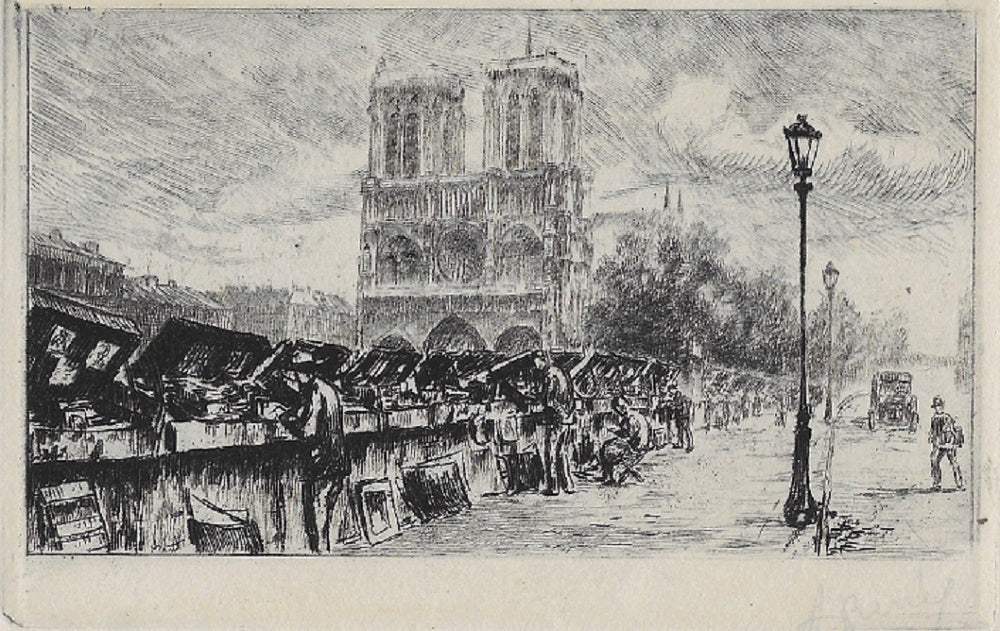 Estampe/Eau-forte originale. Vue animée prise à hauteur de la place Saint-Michel, un promeneur traverse le boulevard alors qu'une voiture arrive à sa droite et rejoint le trottoir où s'alignent des réverbères. Des curieux consultent les livres ou gravures proposés dans les célèbres boites à livres des bouquinistes de la Seine. En arrière-plan la façade de la cathédrale Notre-Dame de Paris. Dans la cuvette, signature illisible au crayon en bd. La feuille 159*201 mm, au TC 76*130 mm, au CP 89*138 mm.
