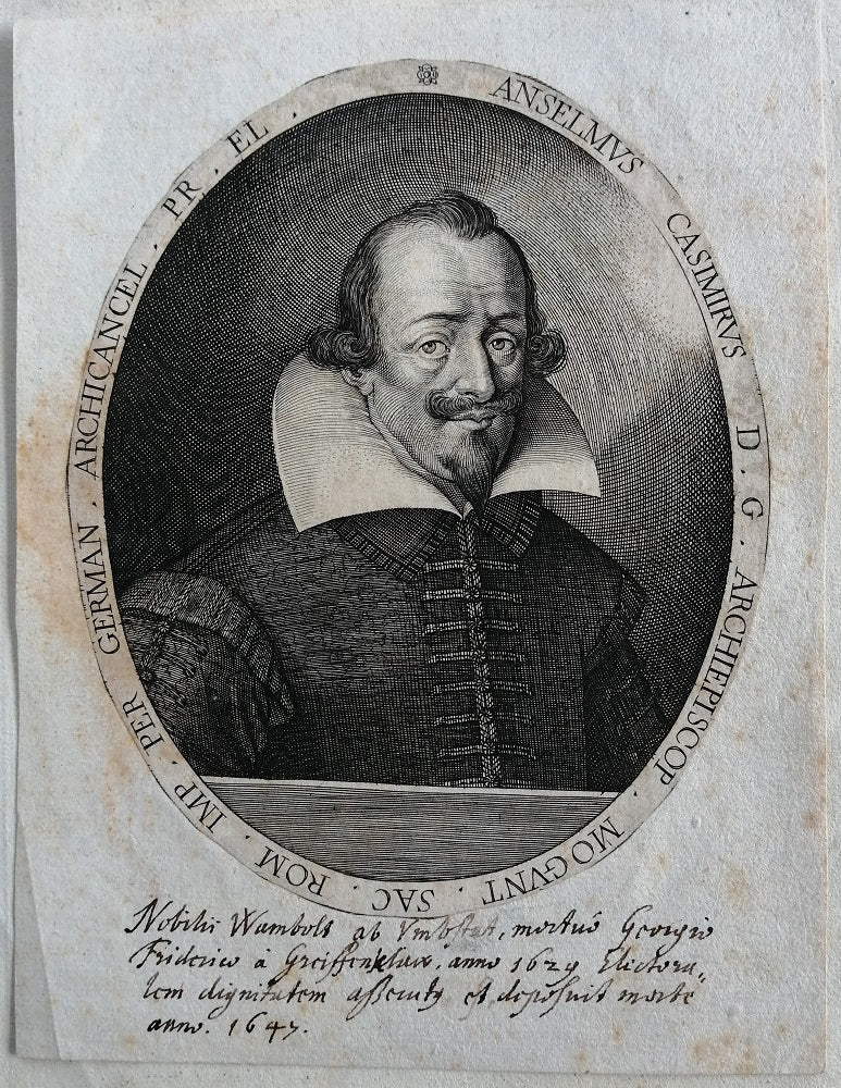 Estampe représentant le portrait en buste d’Anselm Casimir Wambolt von Umstadt Erbischof u. Kurfürst von Mainz (30 novembre 1579 † 9 octobre 1647), archevêque et prince-électeur de Mayence de 1629 à 1647, archichancelier du Saint-Empire romain germanique.