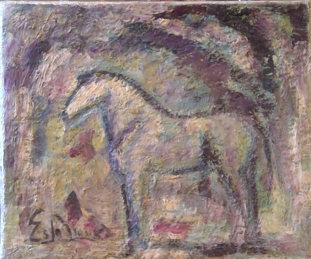 Peinture par Joseph Espalioux (Saint-Bonnet-les-Tours-de-Merle (Corrèze), 8 décembre 1921 † Toulouse, 27 septembre 1986). Technique mixte, plâtre peint sur toile exposée au Salon de Indépendants (1972), Sbg, 46*55 cm. Au dos, adresse sur le châssis en hd, deux étiquettes du Salon en hg, titre en hd, étiquette transporteur en b, n° d’exposition sur montant central en b. Peintre autodidacte, Joseph Espalioux, surnommé peintre de la lumière, se situe volontairement en marge des mouvements picturaux du 20ème siècle. Ses couleurs dansent sous son pinceau et éclairent frénétiquement ces pottocks, poneys ou autres chevaux ariègeois qu'il saisit dans la région de Pamiers, de Foix et de Montségur où il s'est installé. Malgré les supports utilisés (papier, panneau isorel, techniques mixtes), nous oserons un rapprochement avec un art pariétal. Espalioux est inhumé à Pamiers (Ariège). Provenance : Vente de l'atelier, Château de Lasserre, SVV Stanislas Machoïr, Montastruc-la-Conseillère, 28 janvier 2012.