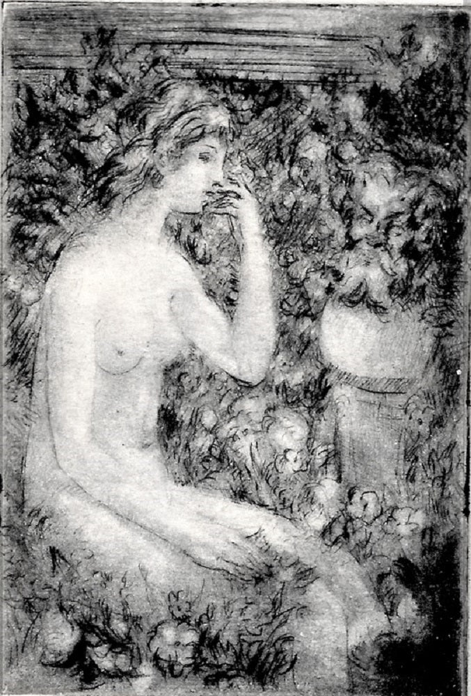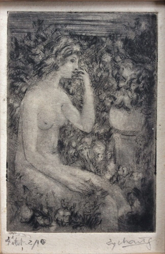Estampe par le peintre et graveur Paul Eychart (Ségura, 9 janvier 1915 † Clermont–Ferrand, 14 juin 2005). Jeune fille nue assise de 3/4 droit. Sous le TC, au crayon, à g 4e état 2/10, à d. signée. La feuille h. 240*179 mm, au TC 88*60.