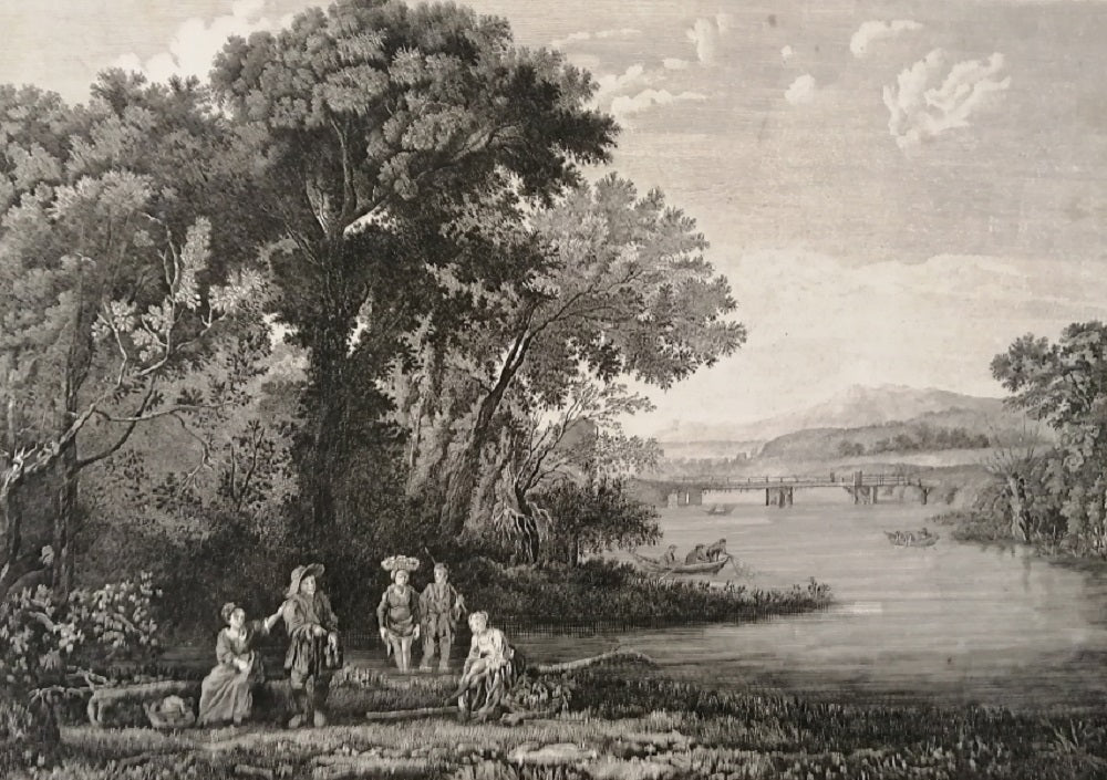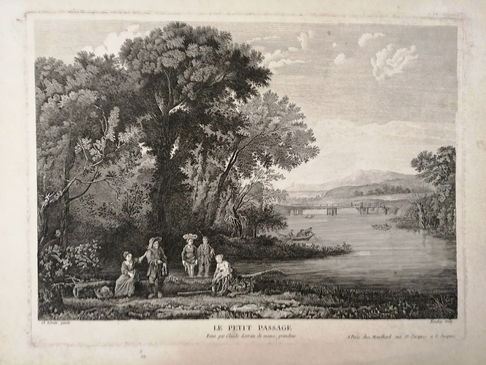 Estampe/Burin par Jean-François Feradiny (1724 † ?) d’après une peinture de même grandeur par Claude Gellée dit le Lorrain (Champagne, 1600 † Rome, 1682), à Paris chez Mondhard rue S.t Jacques à S. Jacques. Au bord de la rivière, une jeune femme remet son bas gauche devant deux couples de paysans à sa droite, en arrière plan, deux barques de pêcheurs, derrière, un pont en bois, dans le fond des montagnes. Sur vergé, marges inégales, Pliures. La feuille h. 350*482 mm, au TC 287*451, au CP 308*468 mm.