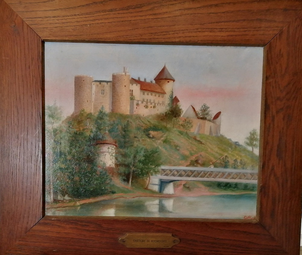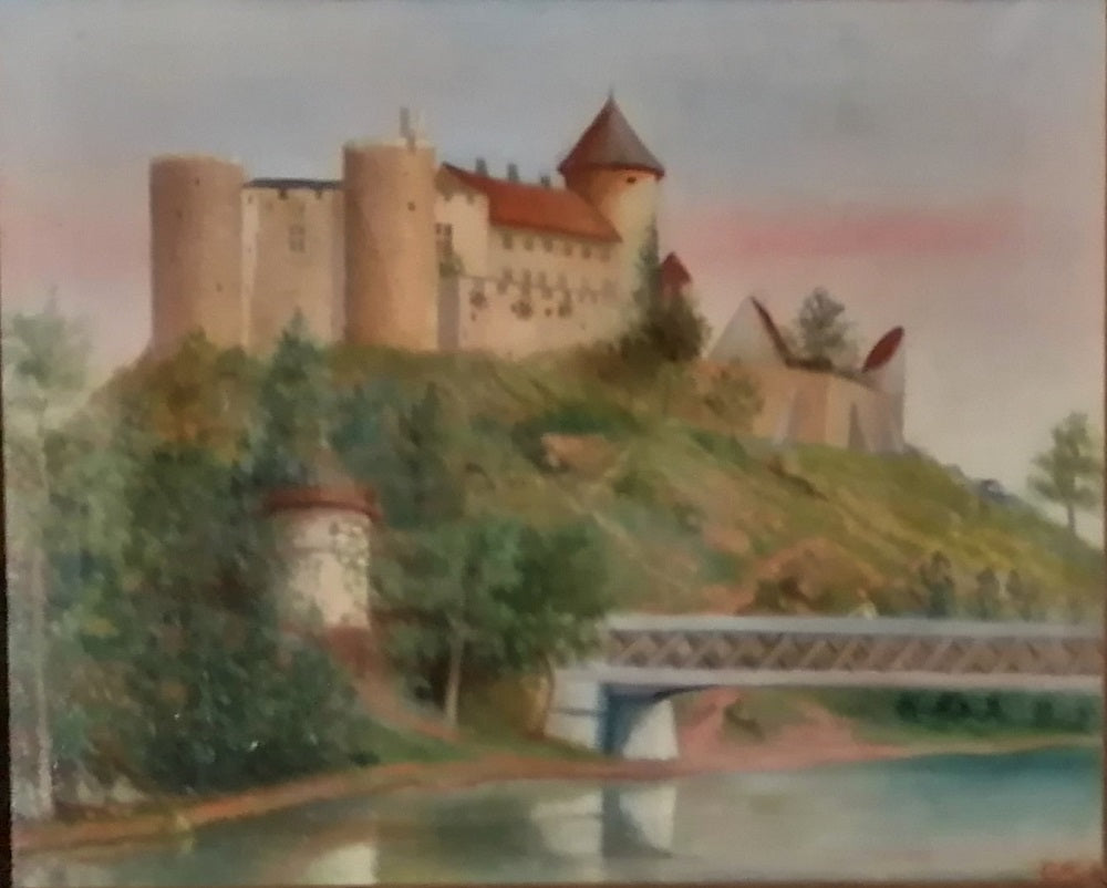 Hst par le peintre bourbonnais Francis Gally. Vue du château de Saint-Bonnet-de-Rochefort (Allier) et du pont des Oyes surplombant la Sioule. Toile restaurée. Né à Neuvial Bègues, Gally s’installe à Vichy et présente à l’Exposition artistique bourbonnaise de Moulins (14 - 29 mars 1925) deux toiles dont Paysage : château de Ligondes St-Bonnet-de-Rochefort (Allier) (n°128). Le château est dans la famille de Ligondès depuis le XVIIe s. Au bas du cadre un cartouche légendé Château de Rochefort | Allier. 33*40 cm, Cadre 500*575 mm.