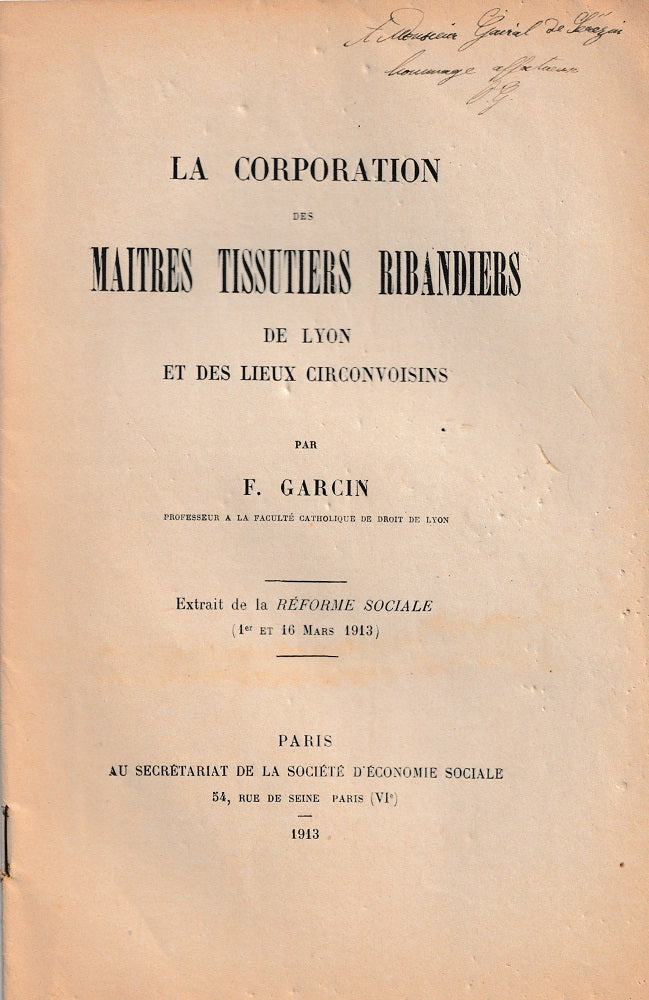 La Corporation des Maitres Tissutiers Ribandiers de Lyon et des lieux circonvoisins, par F. Garcin, professeur à la Faculté Catholique de Droit de Lyon. Extrait de la REFORME SOCIALE, 1er et 16 mars 1913. Paris, Secrétariat de la Société d'Economie Sociale, 1913. Couv souple, agrafée. 28 p. Enrichi d'un envoi autographe de l'auteur en hd du premier plat