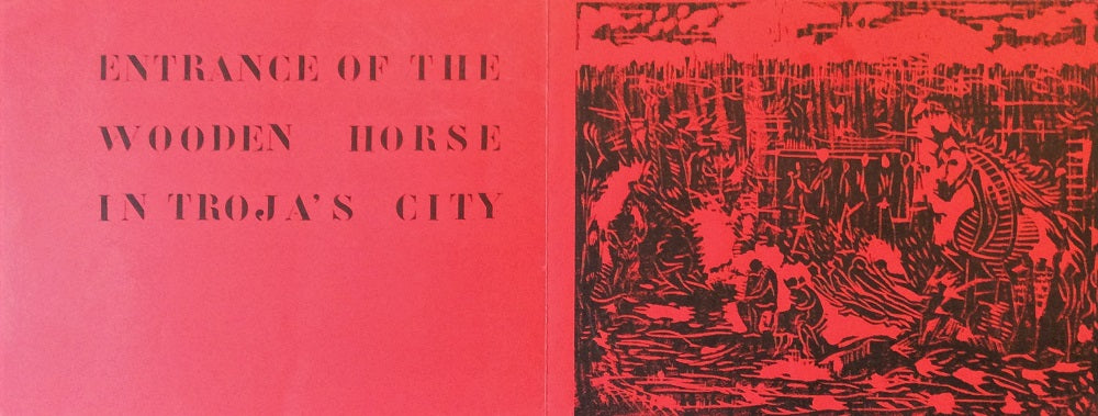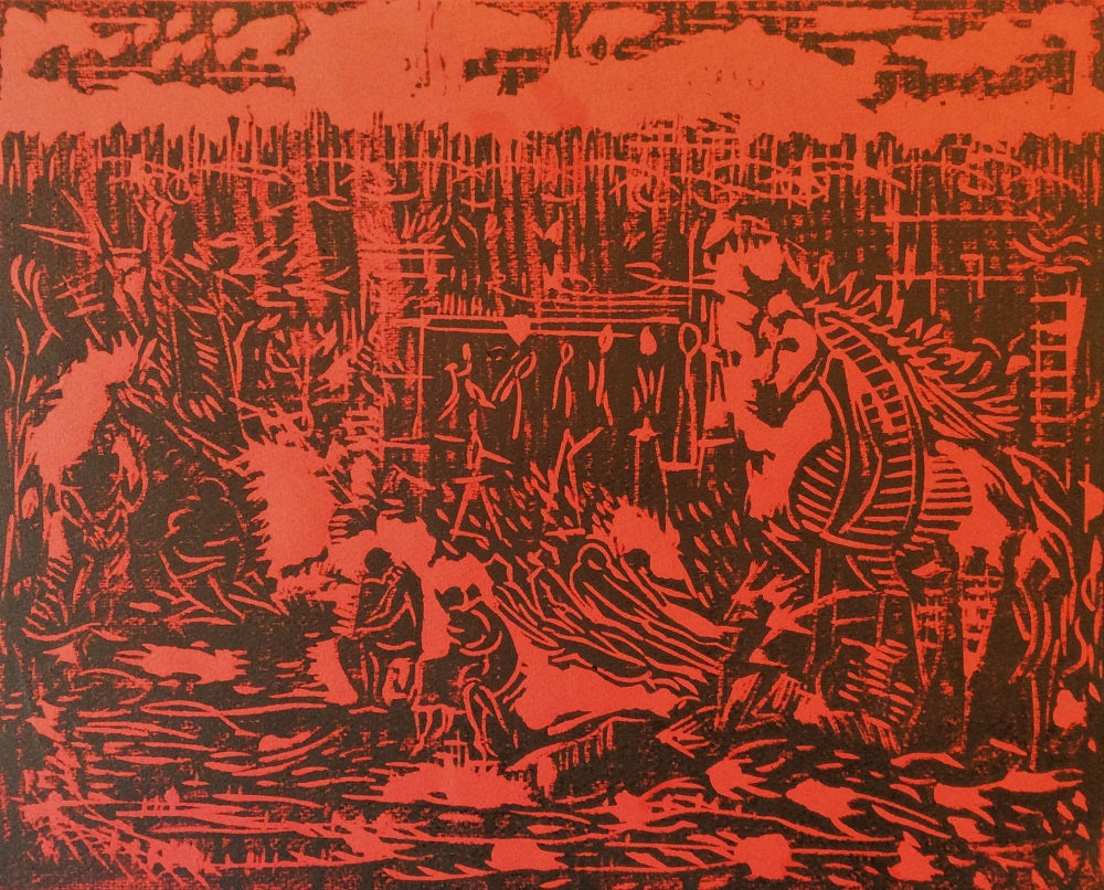 Linogravure par le graveur bourbonnais Jacques Gaulme (Bizeneuille (Allier), 1915 † Montluçon, 8 avril 1998)) sur papier Velin rouge (240*298 mm) inséré dans un portefeuille en Velin rouge avec le titre. Au crayon Signée et datée à gauche.