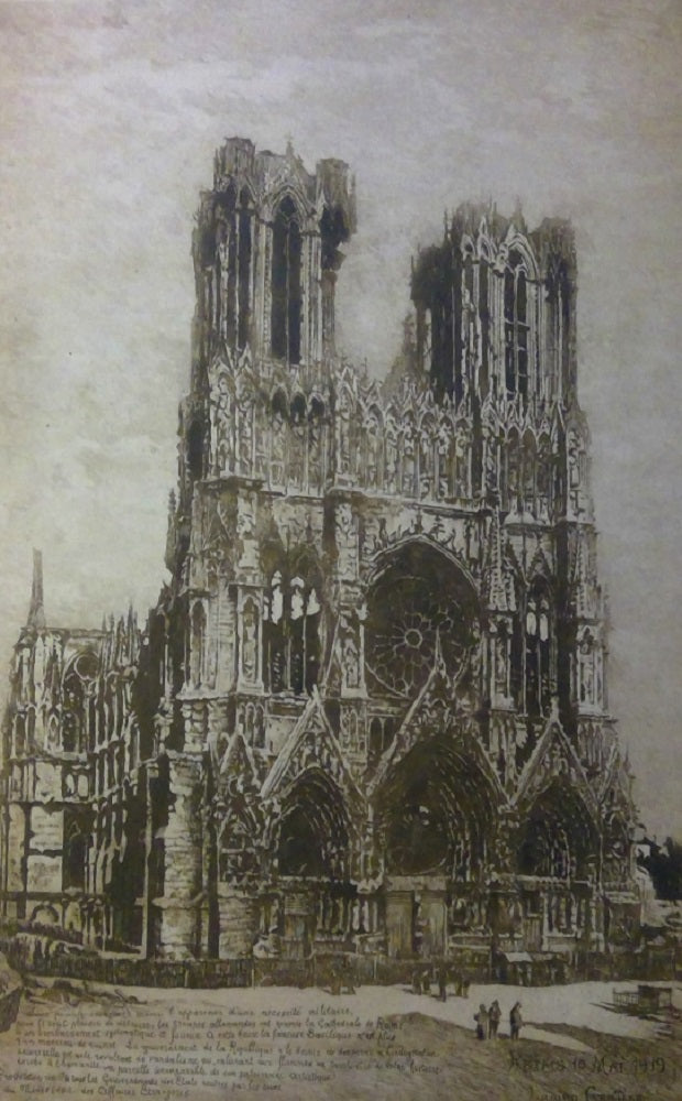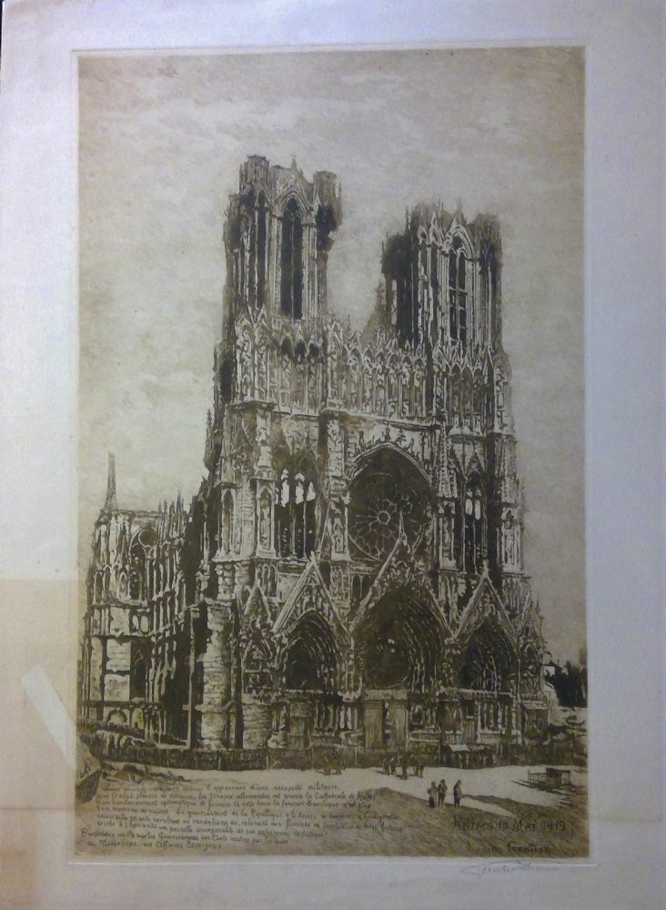 Estampe/Eau-forte par Lucien Marcelin Gautier (Aix-en-Provence, 8 janvier 1850 + Aix-en-Provence, 29 mars 1925). Contresignée au crayon sous le TC à droite. A la pointe dans la planche en bg Sans pouvoir invoquer même l'apparence d'une nécessité militaire, |pour le seul plaisir de détruire, les armées allemandes ont soumis la Cathédrale de Reims | à un bombardement systématique et furieux. A cette heure la fameuse Basilique n'est plus | qu'un morceau de ruines. Le gouvernement de la République a le devoir de dénoncer à l'indignation | universelle cet acte révoltant de vandalisme qui, en livrant aux flammes un sanctuaire de notre histoire | dérobe à l'humanité une parelle incomparable de son patrimoine artistique. | Protestation remise à tous les Gouvernements des Etats neutres par les soins | du Ministère des Affaires Etrangères. à d REIMS 10 MAI 1919 | Lucien Gautier. Sous le texte à gauche un cachet rond suivi d'un numéro au crayon 55. Marges insolés, trace d'un encollage en bg dans la marge. Au CP 60*38 cm, au TC 59*37 cm.