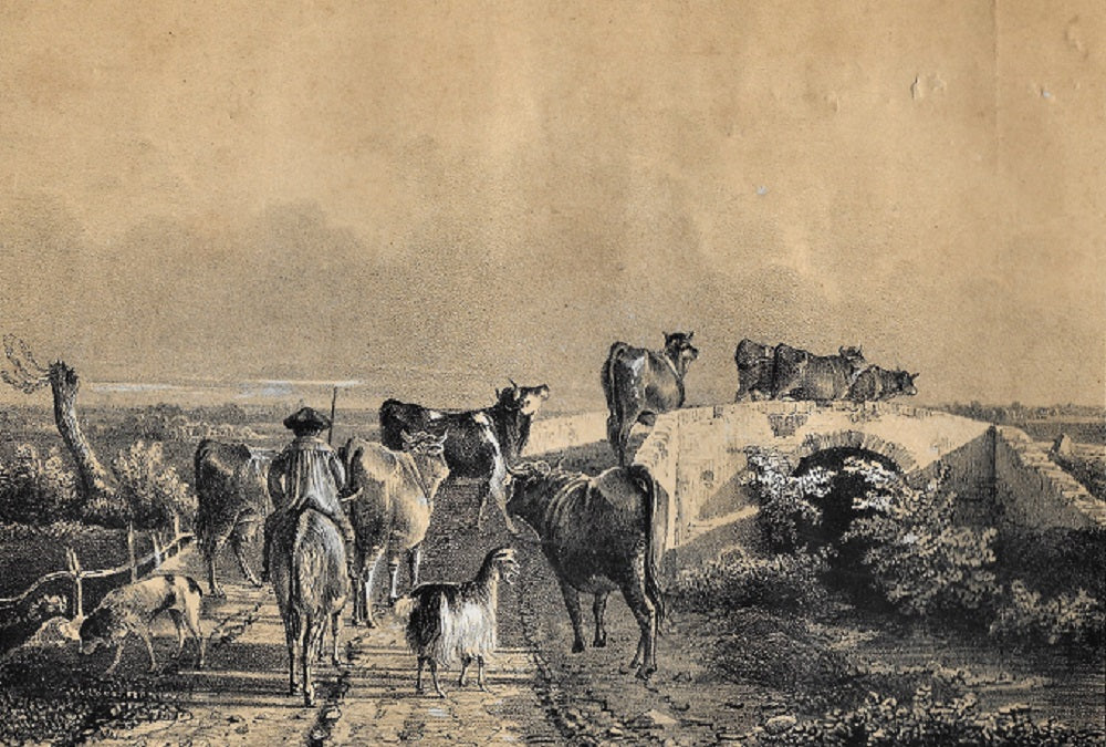 « Le Retour des Champs » Estampe/Lithographie par le peintre animalier, aquarelliste et lithographe Jean-Pierre Paul Gélibert dit Paul Gélibert (La Force (Aude), 25 avril 1802 † La Barthe de Neste (Hautes Pyrénées), 24 septembre 1882) tirée par P. A. Desrosiers à Moulins pour L'Art en Province (125e planche de la revue bourbonnaise, vol. 6 ; le 7ème des 13 envois donnés par Gélibert, de 1835 à 1851). Lithographie d’après sa peinture exposée au Salon de 1841 (n°804) sous le titre Le retour des champs ; paysage avec animaux. Paysage rural des Pyrénées avec de dos un berger monté sur un âne avec à sa gauche un chien et à sa droite une chèvre menant devant lui un troupeau de huit vaches à franchir un pont en pierre BE malgré une déchirure dans la marde gauche, épidermures. La feuille 234*317 mm, le sujet 135*195 mm.