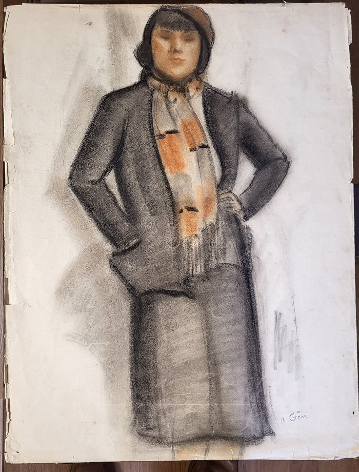 Dessin aux crayons de couleurs des années 1930 signé en bd GEN. 660*495 mm. Déchirures dans les bords.