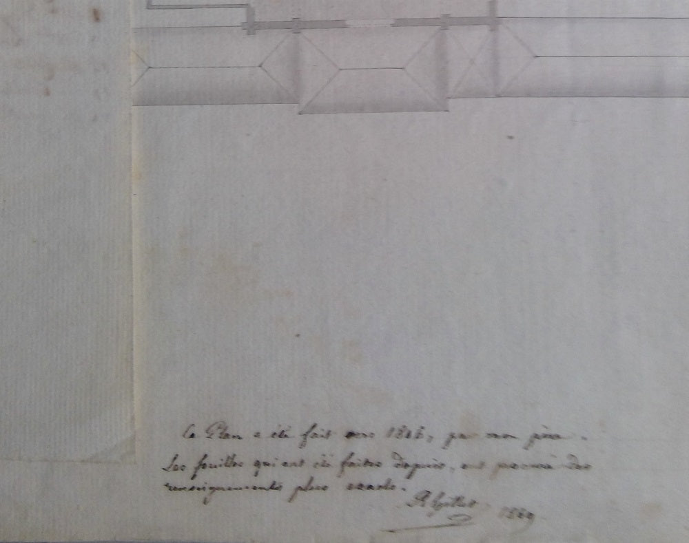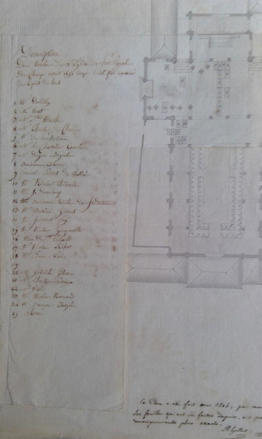 Dessin/Plan sur vergé avec filigrane (représentant un enfant nu debout de profil droit sous une banderole qu’il tient de ses mains) établi par Gillet, annoté par son fils « Ce Plan a été fait en 1806, par mon père. | Les fouilles qui ont été faites depuis, ont procuré des | renseignements plus exacts. | R. Gillet | 1869 ». 373*264 mm. À gauche, encart collé (255*175 mm), reprise d’une partie du plan (transept gauche et croisée du transept) avant élévation du sol avec description des emplacements des tombeaux avec noms. Provenance : Ancienne collection du riomois Paul Vallet.