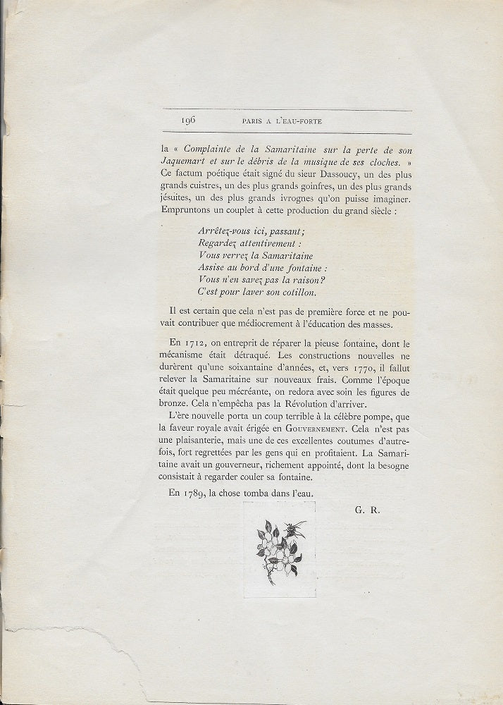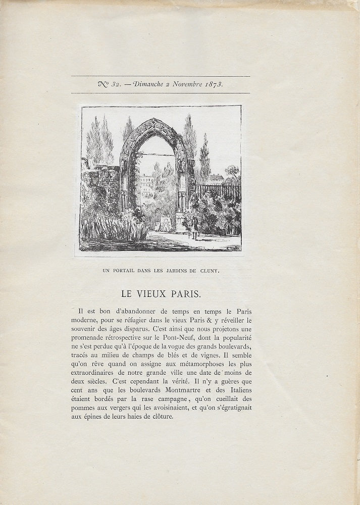 Nota. Vendue avec la livraison complète du n°32 et les épreuves par L. Breton Portail dans les jardins de Cluny, La Seine au Bas-Meudon, et La fontaine-pompe de la Samaritaine au XVIIe siècle, par Jules Adeline Un Canal, Le vieux marché et une gravure anonyme Une mouche. Déchirure coin inférieur droit p. 195.