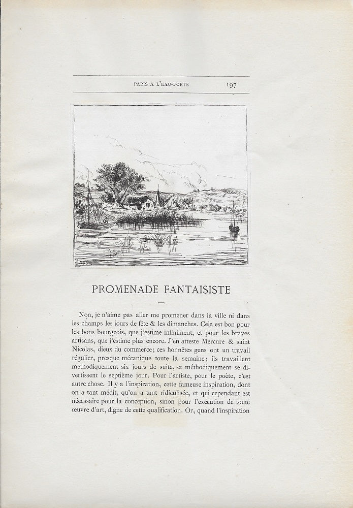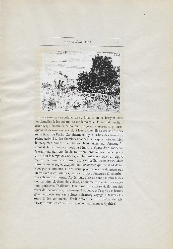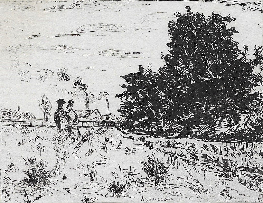 Eau-forte originale par Armand Guillaumin (Paris, 16 février 1841 † Orly, 26 juin 1927) pour PARIS A L'EAU-FORTE, Journal, d'actualité, de curiosité et de fantaisie illustré d'eaux-fortes, 2ème année, n°32 du 2 novembre 1873, illustrant l’article Promenade fantaisiste signé A. B. Titre Bas Meudon et monogramme à la pointe en bas. Une des premières gravures de Guillaumin. Chine appliqué (coupé au TC 68*91 mm. (Réf. : Kraemer, D 7F).