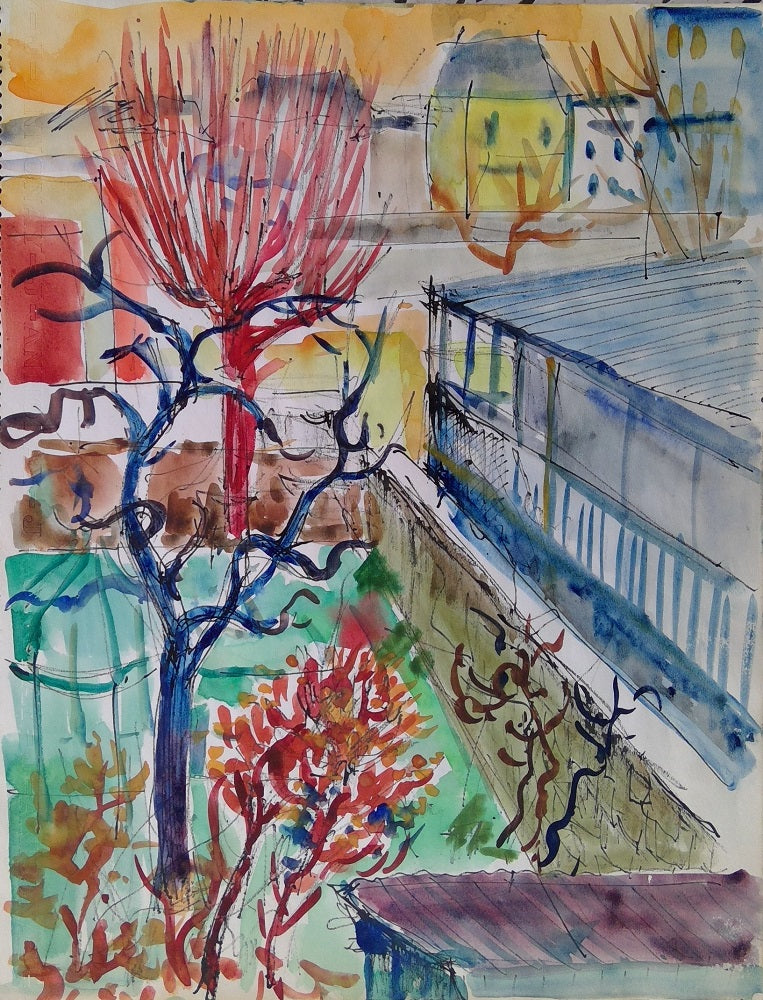02-05 Dessin à l’aquarelle, du peintre arménien Gabriel Harentz (Istanbul, 28 mai 1906 † Courbevoie, ?), ns. Vue de l’atelier du peintre à Courbevoie dans la région parisienne. Trace du carnet à spirale à gauche. 42*33 cm