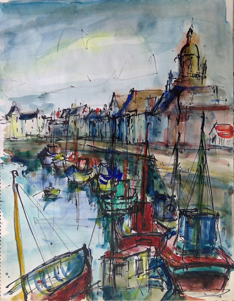 02-09 Dessin à l’aquarelle, du peintre arménien Gabriel Harentz (Istanbul, 28 mai 1906 † Courbevoie, ?), ns. Port non identifié (Bretagne ? Loire-Atlantique ? Le Croisic ?) avec chalutiers et bateaux. Trace du carnet à spirale à gauche. 42*33 cm