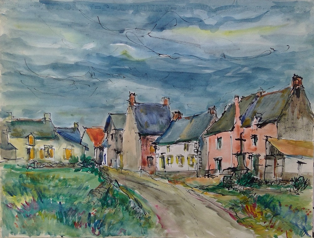 02-03 Dessin à l’aquarelle, du peintre arménien Gabriel Harentz (Istanbul, 28 mai 1906 † Courbevoie, ?), ns. Ruelle, avec croix, de village non identifié : Bretagne ? Loire-Atlantique ? Environs du Croisic ? Trace d’insolation en bas, et du carnet à spirale en haut. . 33*42 cm