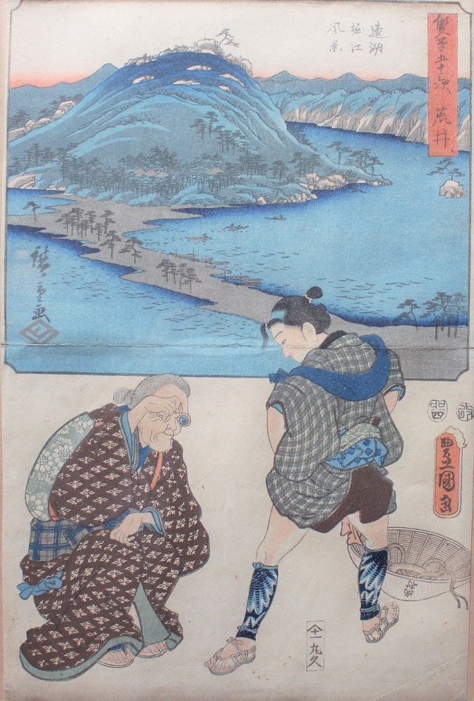 Estampe japonaise, bois gravé couleurs, représentant deux personnage et un paysage lacustre. Aux gares de Hakone et d'Arai se trouvaient des points de contrôle gouvernementaux où les voyageurs devaient montrer leurs papiers et confirmer leur identité, parfois même être inspectés physiquement par de vieilles femmes engagées à cet effet. Ici, un jeune garçon prouve apparemment qu'il est bien un garçon et non une femme voyageant déguisé, puisque les épouses des daimyo étaient tenues de rester à Edo en tant qu'otages du shogun. Paysage dessiné par Utagawa Hiroshige (Edo, 1797 † Edo, 12 octobre 1858), figures dessinées par Utagawa Kunisada dit TOYOKUNI III (1786 † 12 janvier 1865 )., les Cinquante-trois stations du Tokaido par deux pinceaux, Sohitsu Gojusan tsugi. Cachets de Hiroshige ga et Toyokuni ga, Cachet de l’éditeur Maruya Kyushiro,. oban tate-e 36*23 cm