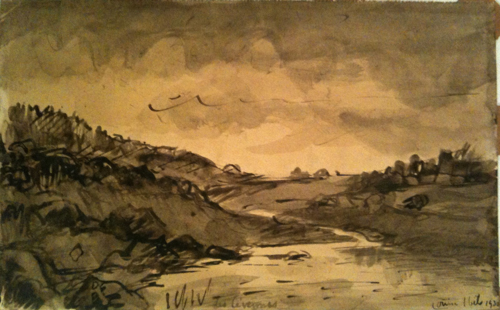 Dessin, Lavis à l’encre par Louise Ibels (Nogent-sur-Marne, 11 décembre 1891 † 1965). En bas au centre, titré Les Cévennes, SDbd Louise Ibels 1930, Au verso sur le carton d'encadrement étiquette avec mentions manuscrites à l'encre Dessin teinté de Louise Ibels | L'étang Cévennes. 1930. | [très admiré, m'a-t-elle dit, de feu son frère, Jean I.].