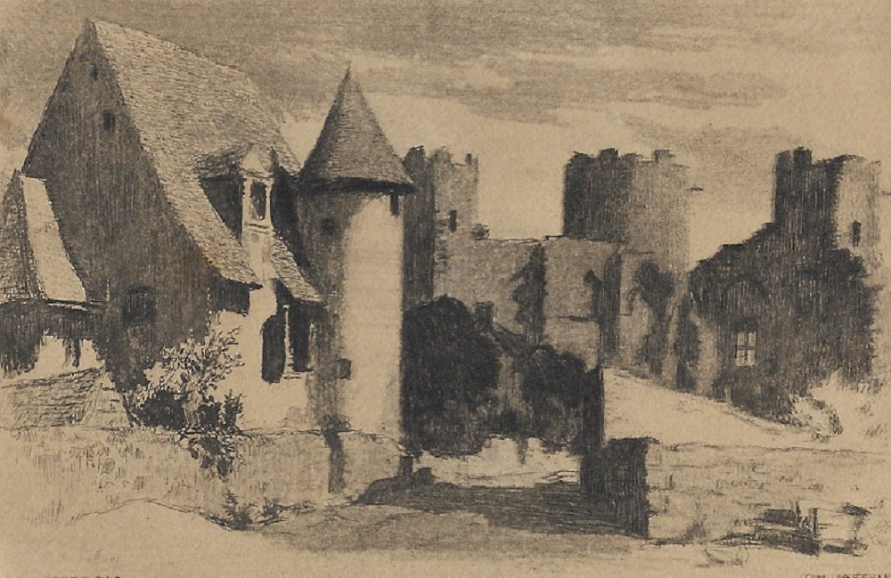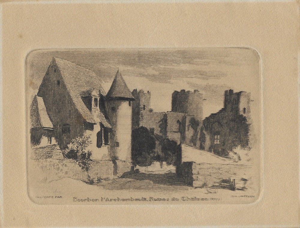 Estampe/Eau-forte par Charles Jaffeux (Riom (Puy-de-Dôme), 17 janvier 1902 † Riom, 14 mars 1941), tirage bistre. Impression dans la planche en bg EAU FORTE PAR en bd CH. JAFFEUX, en dessous BOURBON L’ARCHAMBAULT RUINES DU CHÂTEAU (XIVE s). Jaffeux semble avoir commencé sa production d'eaux-fortes sur le Bourbonnais au début de l’année 1926. Le 12 août 1931, il mentionne son travail sur les gravures de Bourbon L’Archambault et Souvigny. La feuille 252*163 mm, au TC (cuire arrondi aux angles) 83*125 mm.
