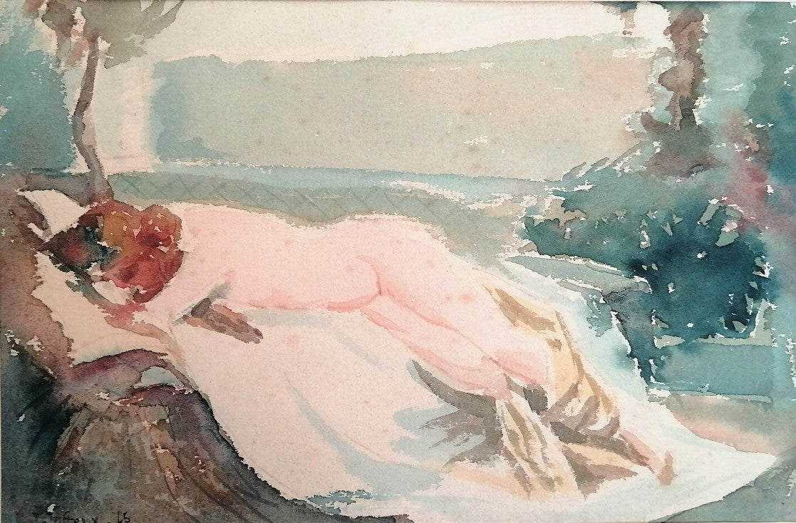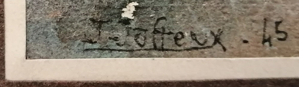 Dessin Aquarelle par le peintre émailleur auvergnat Jean Jaffeux (Riom, 1931 † Riom, 4 juin 2015), SDbg J. JAFFEUX 45. à vue 16*24 cm, sous double passe-partout bicolore 30*40 cm.