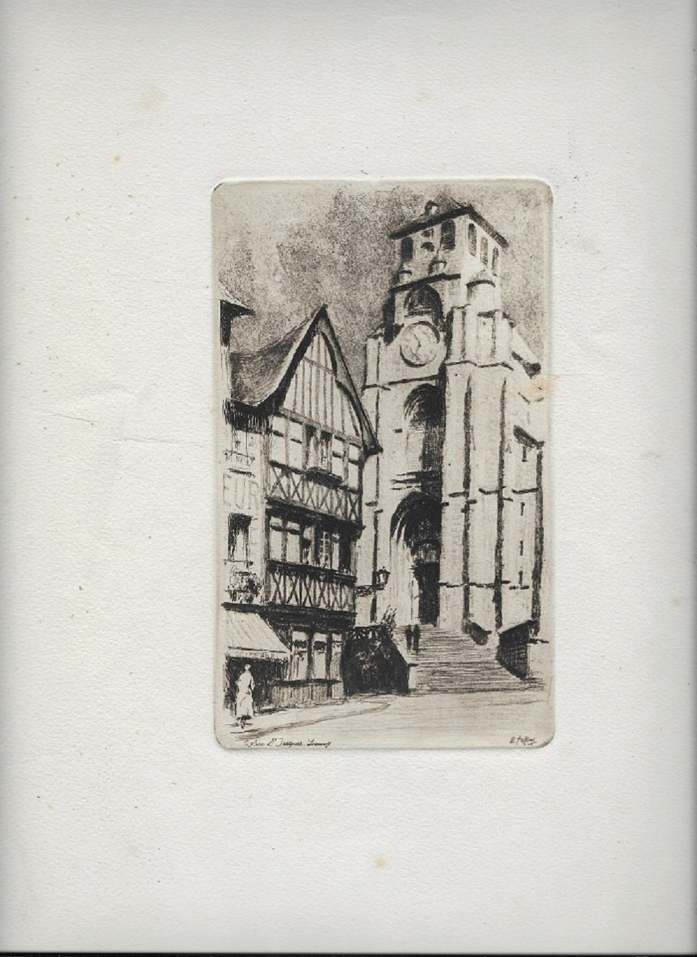 Estampe/Eau-forte par Charles Jaffeux (Riom (Puy-de-Dôme), 17 janvier 1902 † Riom, 14 mars 1941) en portefolio sur vélin Johannot. Titré sur le premier plat, gravure en 3ème p. Déport sur le 2ème plat. La feuille 338*280 mm, au CP 178*108 mm. Dans la planche, titre en bg, signature en bd. Vue animée prise dans le premier tiers du 20e s., d'une maison à pans de bois devant le clocher de l'église gothique Saint Jacques.