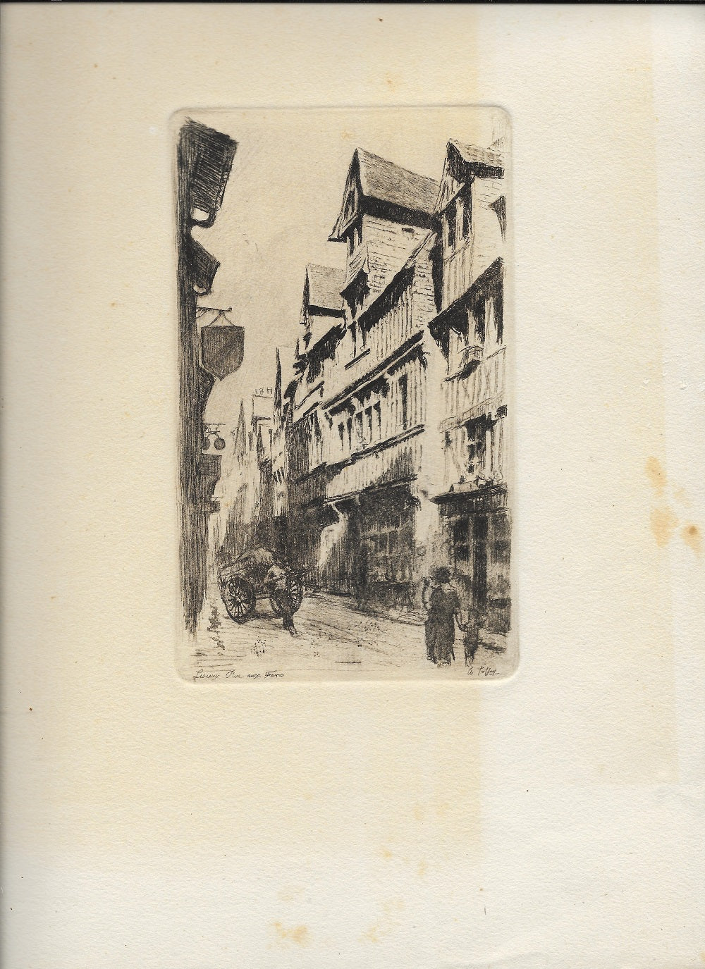 Estampe/Eau-forte par Charles Jaffeux (Riom (Puy-de-Dôme), 17 janvier 1902 † Riom, 14 mars 1941) en portefolio. Titré sur le premier plat, gravure en 3ème p. Déport sur le 2ème plat. La feuille 338*280 mm, au CP 175*105 mm. Dans la planche, titre en bg, signature en bd. Vue animée de cette célèbre rue de la capitale du pays d'Auge (Calvados, Normandie) avec un marchand ambulant et sa charrette, au premier plan à d une mère et son enfant. A noter les enseignes sur les immeubles à g, face aux maisons du XVe à colombage. Epidermures dans les marges sans atteinte au sujet.