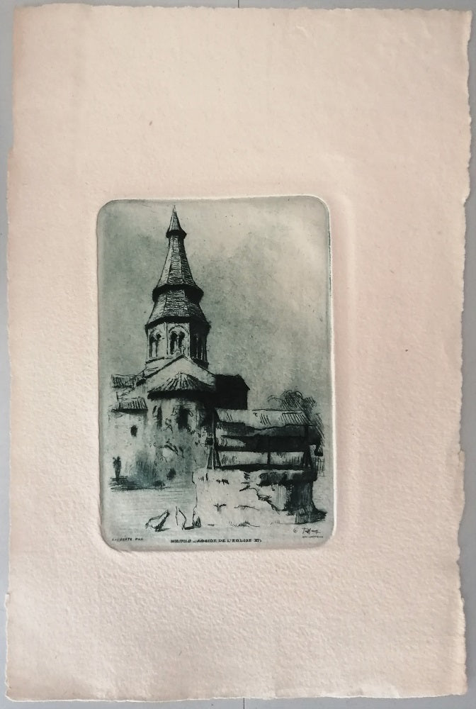 Estampe/Eau-forte par Charles Jaffeux (Riom (Puy-de-Dôme), 17 janvier 1902 † Riom, 14 mars 1941). Jaffeux semble avoir commencé sa production d'eaux-fortes sur le Bourbonnais au début de l’année 1926. Il prévoit 4 gravures sur Vichy en août 1926, et 2 autres en octobre 1927. Premier plan champêtre pour mettre en évidence cette chapelle rurale de Néris-les-Bains. La feuille (Vélin Johannot non ébarbé) 248*161 mm, au TC 115*75 mm.