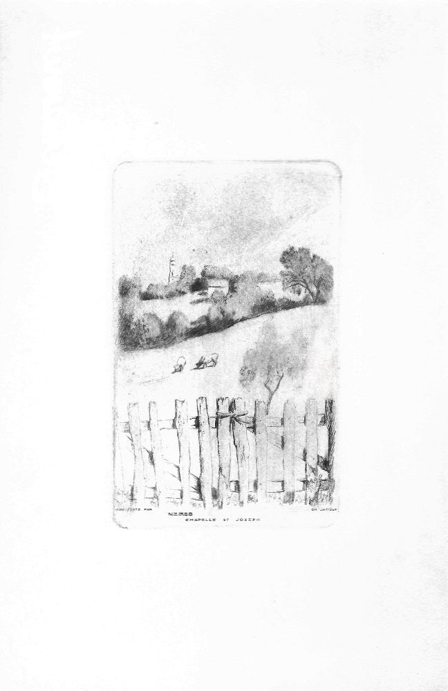 Estampe/Eau-forte par Charles Jaffeux (Riom (Puy-de-Dôme), 17 janvier 1902 † Riom, 14 mars 1941). Jaffeux semble avoir commencé sa production d'eaux-fortes sur le Bourbonnais au début de l’année 1926. Il prévoit 4 gravures sur Vichy en août 1926, et 2 autres en octobre 1927. Premier plan champêtre pour mettre en évidence cette chapelle rurale de Néris-les-Bains. La feuille (Vélin Johannot non ébarbé) 248*161 mm, au TC 115*75 mm.