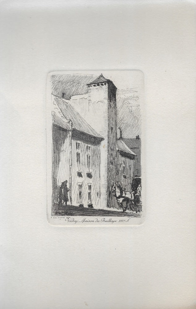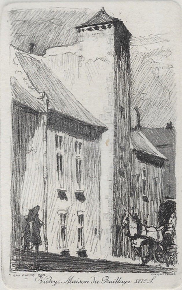 Estampe/Eau-forte par Charles Jaffeux (Riom (Puy-de-Dôme), 17 janvier 1902 † Riom, 14 mars 1941). Jaffeux semble avoir commencé sa production d'eaux-fortes sur le Bourbonnais au début de l’année 1926. Il prévoit 4 gravures sur Vichy en août 1926, et 2 autres en octobre 1927. Vue animée de la façade arrière du Castel-Franc, un fiacre tiré par un cheval remonte la rue alors que deux personnes se rangent contre le mur. La feuille 254*166 mm, au TC 115*75 mm.