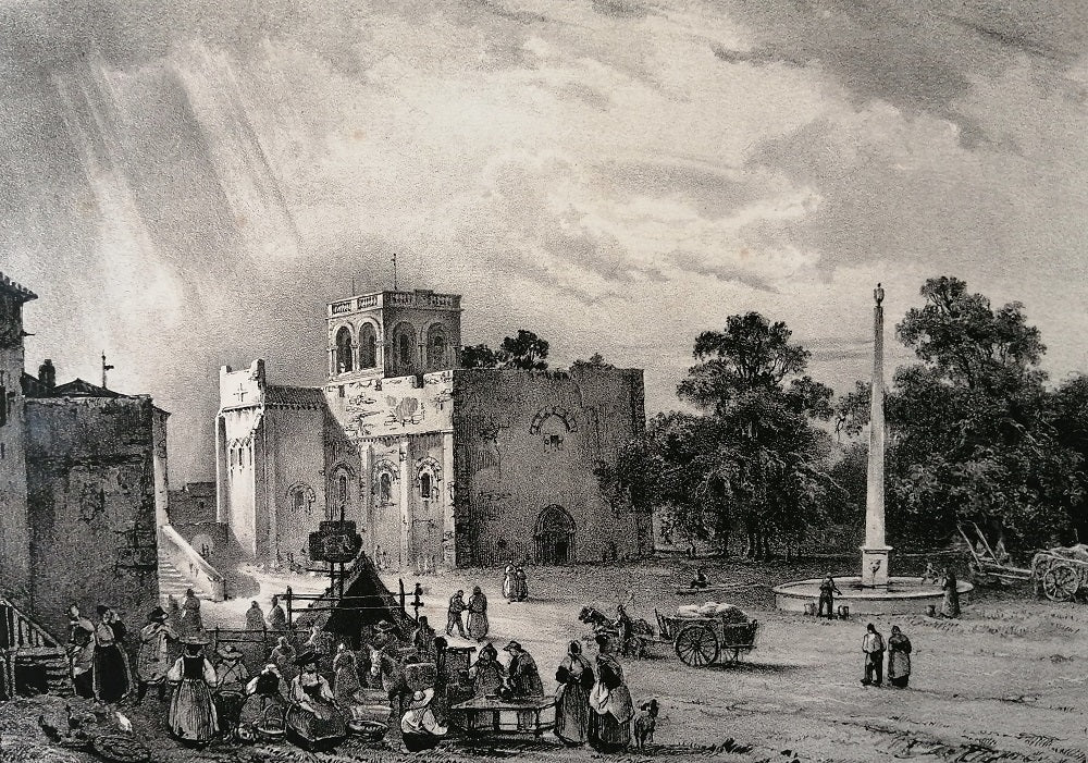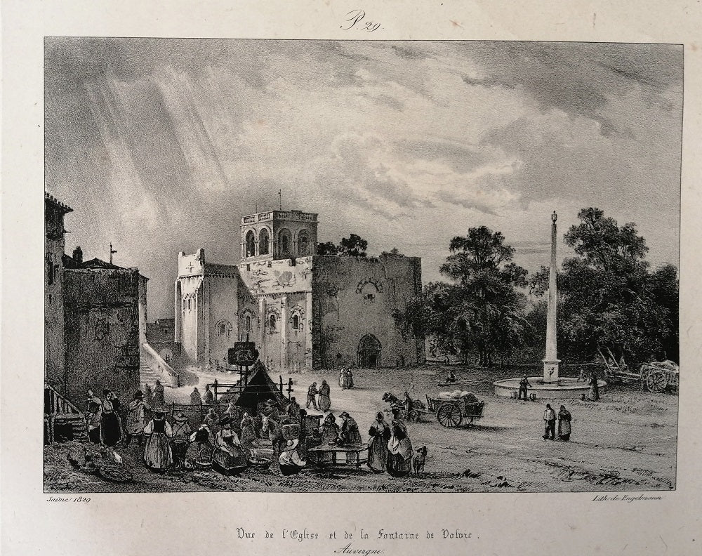 Lithographie sur chine (199*243 mm) contrecollée sur vélin par Jean-François Gem, dit Ernest Jaime (Paris, 28 avril 1804 † Versailles, 6 juin 1884). Pl. 29 pour Voyages dans l’Ancienne France Auvergne du baron Isidore Taylor tirée par Engelmann. Sous le sujet à g Jaime 1829. Paysage animé avec au premier plan une scène de genre représentant un jour de marché sur la place de Volvic dans le Puy-de-Dôme. Epidermures et froissement sur le vélin. Le sujet 158*220 mm.