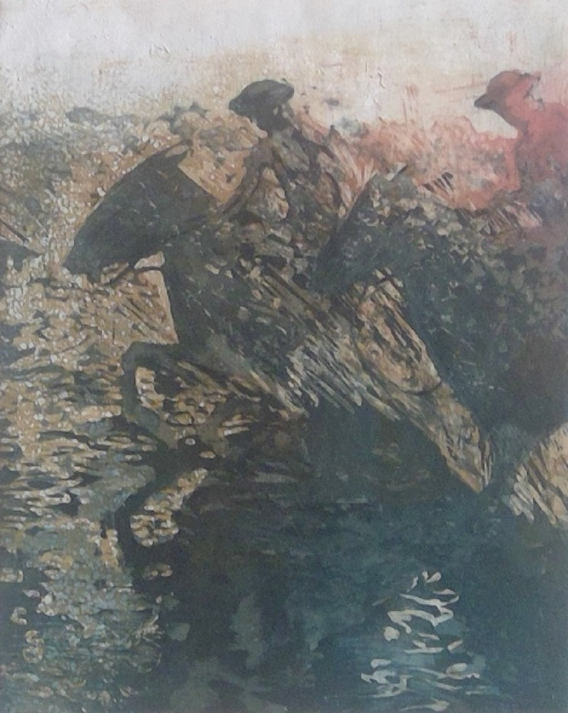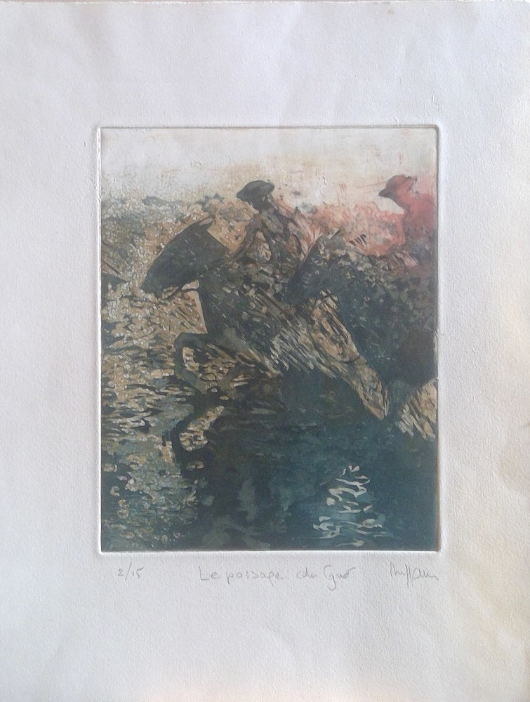 Aquatinte originale sur 2 plaques par Marie-Josèphe James (Née en 1936), Deux cavaliers franchissent au galop un gué. Sous le CP, au crayon justifiée à g 2/15, titrée au centre, sbg. La feuille 328*253 mm, au TC199*158 mm.