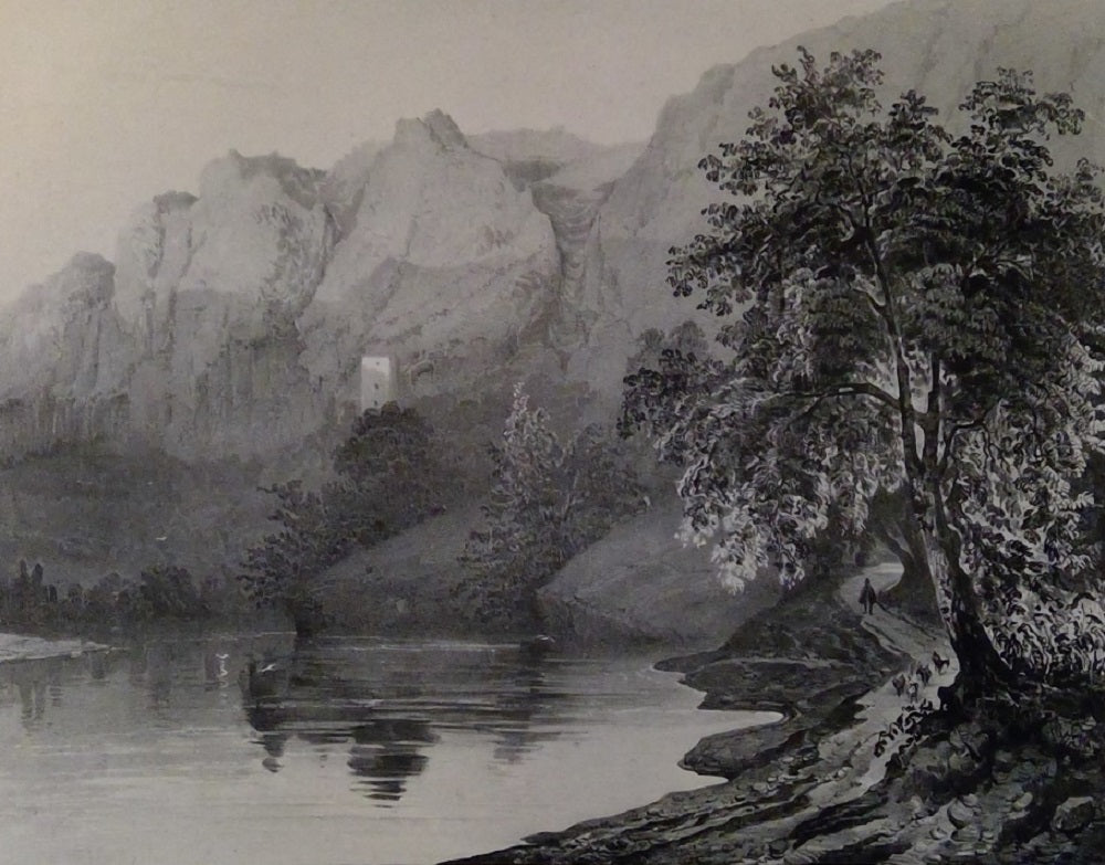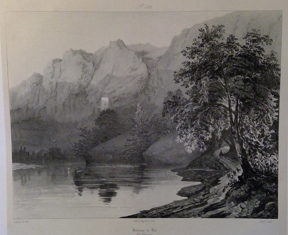 Estampe sur chine dessinée par Léon Jean Baptiste Sabatier ( ? † 1887) Lithographie de Jean Baptiste Joseph Jorand (1788 † 1850) tirée par Engelmann. Pl. 182 pour Voyages dans l’Ancienne France Auvergne du baron Isidore Taylor. Sous le sujet à g Sabatier 1832. Paysage romantique, à d de la Sioule, un chemin, emprunté par un promeneur, bordé par des feuillus monte vers l’ermitage de Blot l’église que l’on devine au centre. Dim. : 460*295 mm.