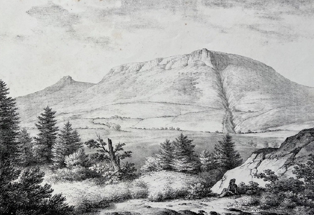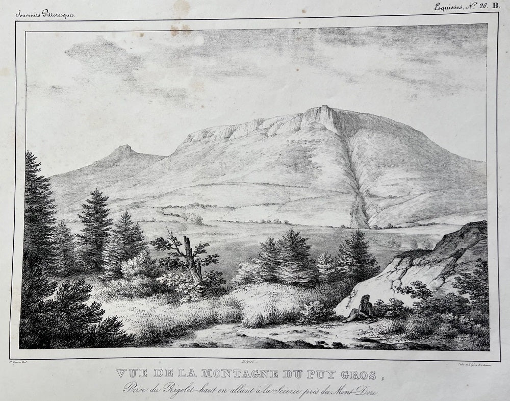 Lithographie dessinée par Pierre Lacour (1778 † 1859). Au-dessus du sujet à g Souvenirs Pittoresques, à droite Esquisses, N°26 B ; au-dessous du sujet à g P. Lacour del au centre Déposé à d Lith de Légé, à Bordeaux, en dessous au centre VUE DE LA MONTAGNE DU PUY GROS | prise du Rigolet-haut en allant à la Scierie près du Mont-Dore. Paysage animée : au premier plan à droite un paysan de face assis contre un rocher au milieu de taillis, et sapins. Hist. : Une des 17 lithographies réalisées par Lacour sur son séjour au Mont-Dore et publiées à Bordeaux sous le titre Souvenirs pittoresques du Mont Dore, esquisses faites d’ près nature et lithographiées. épidermures. Bibl. : Lara. La feuille 420*565 mm,