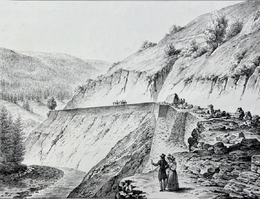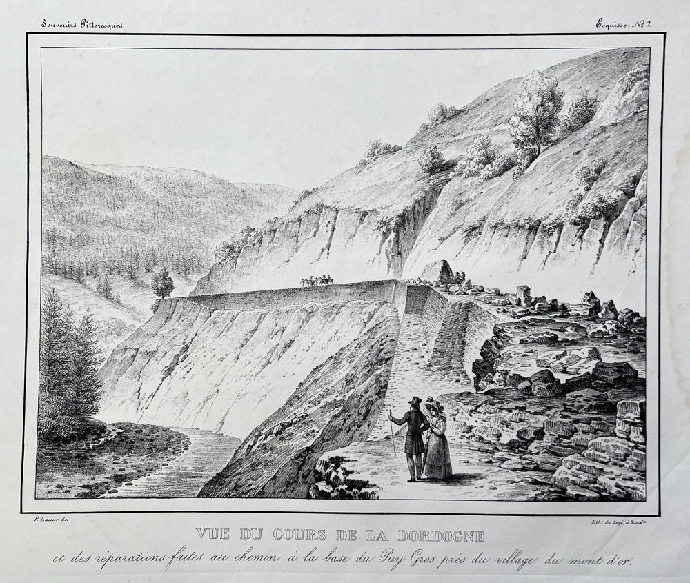 Lithographie dessinée par Pierre Lacour (1778 † 1859). Au-dessus du sujet à g Souvenirs Pittoresques, à droite Esquisse, N°2 ; au-dessous du sujet à g P. Lacour del à d Lith de Légé, à Bordeaux, en dessous au centre VUE DU COURS DE LA DORDOGNE | et des réparations faites au chemin à la base du Puy Gros près du village du Mont-d’Or. Vue animée : un couple de bourgeois regarde la rivière, au bout de la route encombré de gravas deux ouvriers discutent près de leur cabane de chantier, au loin trois cavaliers dont les montures sont menés par deux paysans descendent la route. Hist. : Une des 17 lithographies réalisées par Lacour sur son séjour au Mont-Dore et publiées à Bordeaux sous le titre Souvenirs pittoresques du Mont Dore, esquisses faites d’ près nature et lithographiées. Large mouillure en marge droite. Petite auréole en marge gauche. Bibl. : Lara. La feuille 420*567 mm,