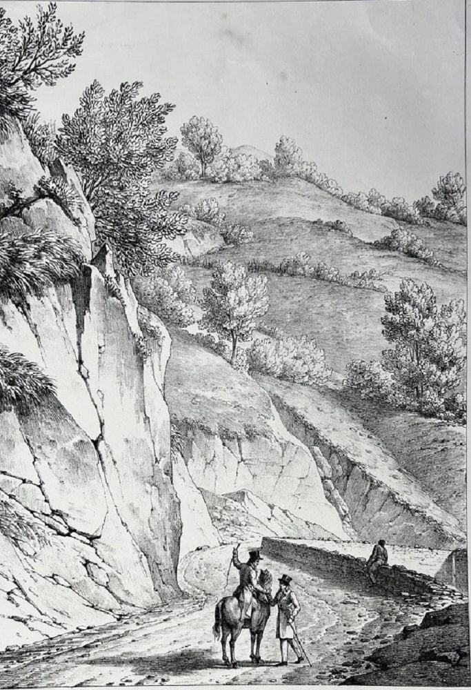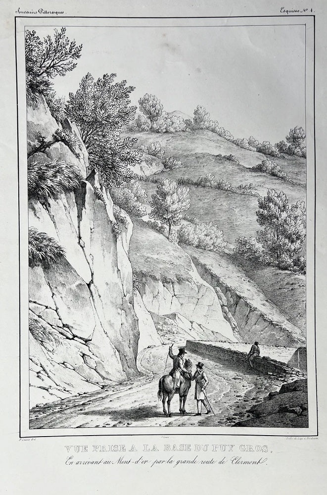 Lithographie dessinée par Pierre Lacour (1778 † 1859). Au-dessus du sujet à g Souvenirs Pittoresques, à droite Esquisse, N°1 ; au-dessous du sujet à g P. Lacour del au centre Déposé à d Lith de Légé, à Bordeaux, en dessous au centre VUE PRISE DE LA BASE DU PUY GROS | en arrivant au Mont-d’Or par la grande route de Clermont. Vue animée : à l’amorce d’un tournant un cavalier tient la main d’un bourgeois à pied alors que plus loin un paysan de dos assis sur un parapet se penche vers le précipice. Hist. : Une des 17 lithographies réalisées par Lacour sur son séjour au Mont-Dore et publiées à Bordeaux sous le titre Souvenirs pittoresques du Mont Dore, esquisses faites d’ près nature et lithographiées. Mouillures en marge droite. Auréole en marge gauche. Bibl. : Lara. La feuille 421*575 mm,