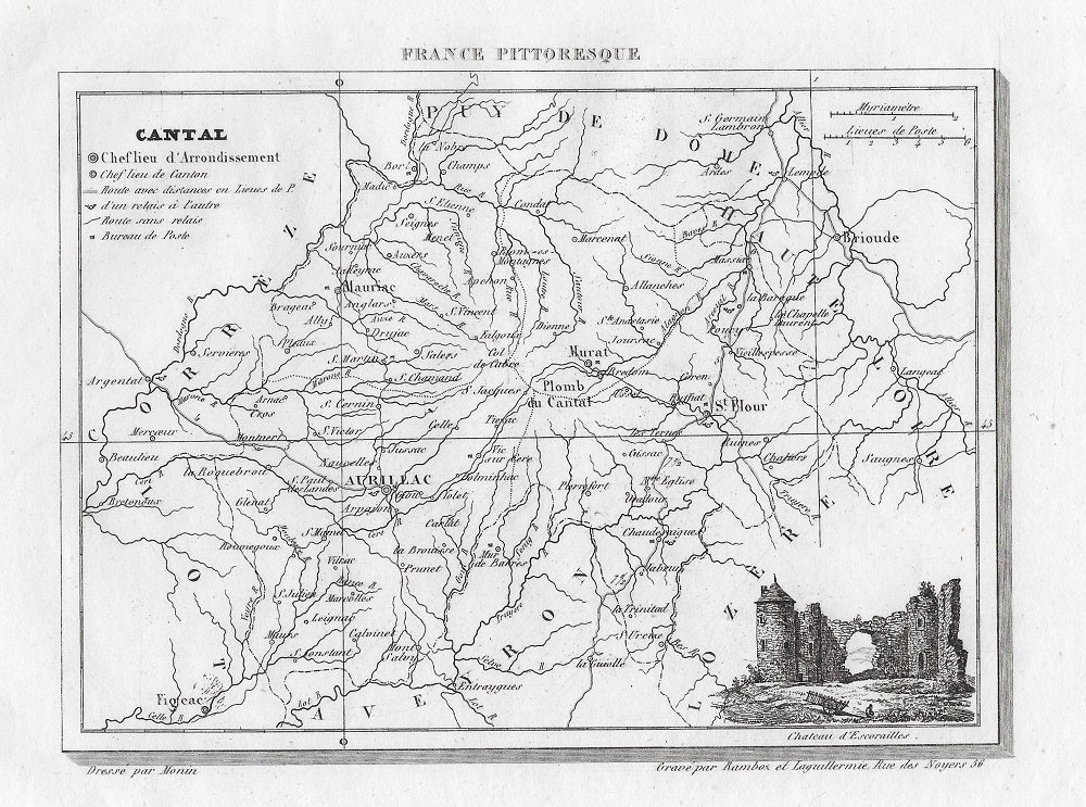Extraite de la France Pittoresque d’Abel Joseph, comte Hugo (1798 † 1855), frère de Victor Hugo. dressée par Monin, gravée par Laguillermie et Rambos, Rue des Noyers, N°36. Avec, en bas à droite, une représentation gravée du château d’Escorailles. La feuille 182*276 mm, le sujet 119*167 mm.