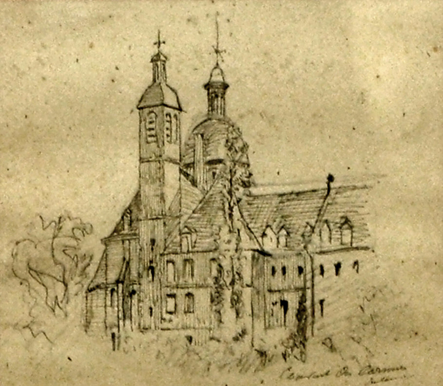 Dessin par Maxime Lalanne (Bordeaux, 27 novembre 1827 † Nogent sur Marne, 29 juillet 1886) titré et signé en bd Couvent des Carmes | Lalanne. À vue 115*125 mm (Sous passe-partout 24*30 cm). Hist. : L’Église Saint-Joseph des Carmes édifiée en 1625 a traversé plusieurs moments historiques et connu de nombreuses affectations avant de devenir aujourd’hui la Chapelle de l’Institut Catholique de Paris
