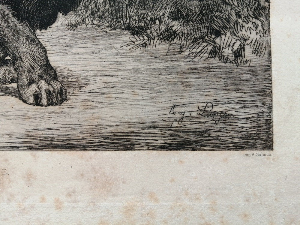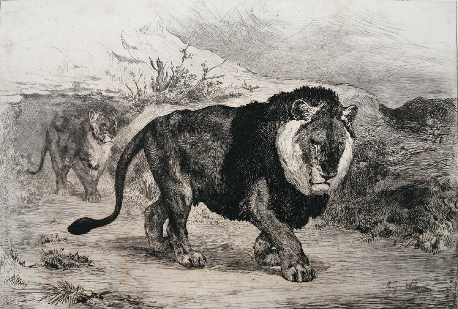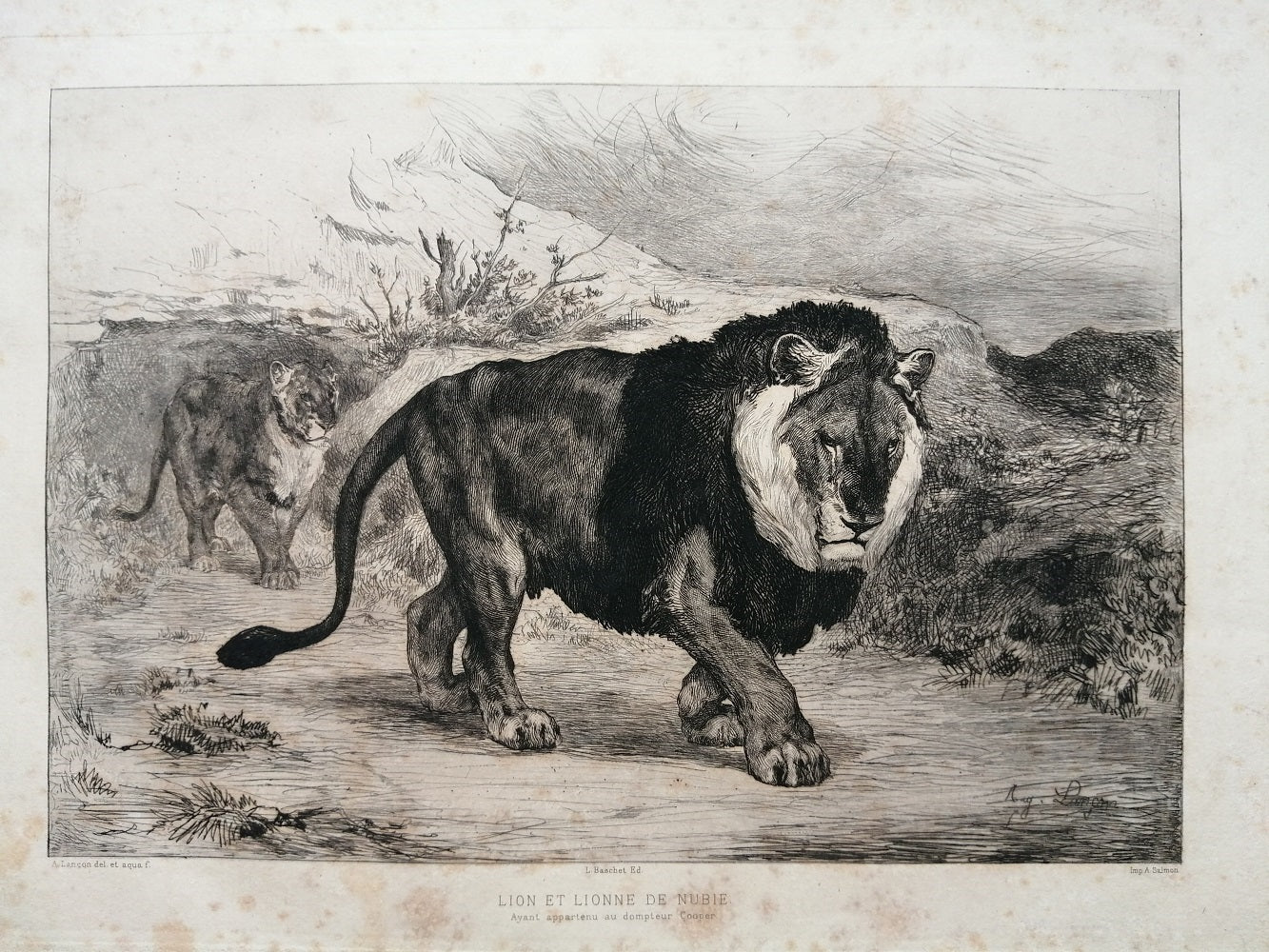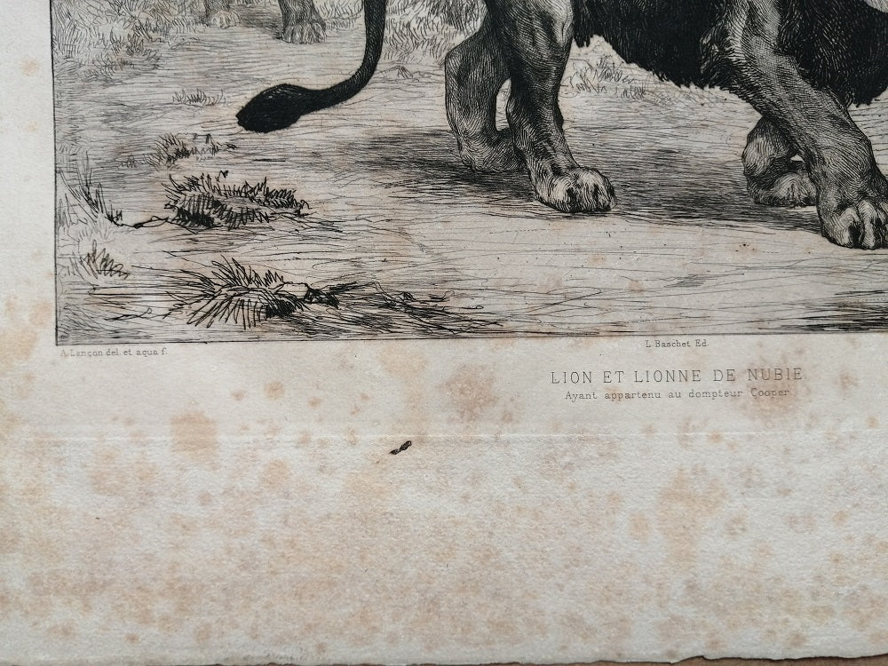 | Ayant appartenu au dompteur Cooper. Eau-forte originale par Auguste-André Lançon (Saint-Claude (Jura), 16 décembre 1836 † Paris, 14 avril 1885) : sur papier Vergé. Vue d'un lion de profil droit marchant de gauche à droite. Sbd dans la planche. Sous le TC, à g A. Lançon del et aqua f., au centre L. Baschet Ed., à d Imp. A. Salmon. Epidermures. Lançon a peint un Lion du cap à crinière noire vers 1865 (Hst, 455*610 mm, Sbd) dont la posture est assez similaire. Planche pour l'ouvrage Les Animaux chez eux, Imprimé par A. Salmon. Publié et édité par Ludovic Baschet, Librairie d'Art, Paris. Feuille 310*443 mm, TC 188*278 mm..