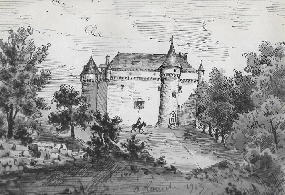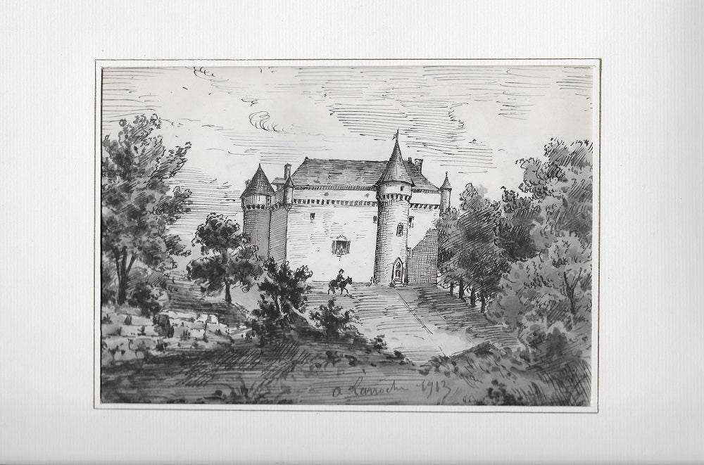 Dessin, encre et lavis par le graveur auvergnat Antonin Larroche, né à Clermont-Ferrand (Puy-de-Dôme), SDb au centre a Larroche 1913, annoté au verso, en bas parallèlement au bord gauche les mots rayés 37 | Château d’Hauzers, au centre VIEILLE AUVERGNE | 1845 CHÂTEAU D’HAUZERS | E. A.,. Projet pour une gravure de ce château du XIVe reconstruit au XVIe siècle, situé à Auzers dans le Cantal. Paysage animé, un cavalier se dirige vers l’entrée du château, d’après une estampe romantique du XIXe. Passe-partout 240*305 mm. Dim. : 152*210 mm.