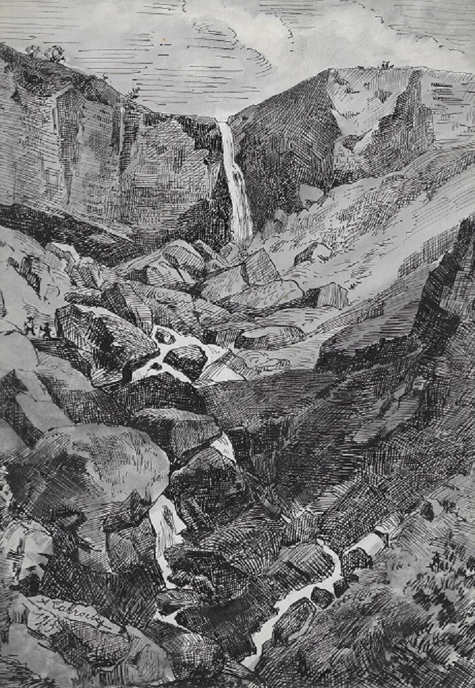 Dessin, encre et lavis par le graveur auvergnat Antonin Larroche, né à Clermont-Ferrand (Puy-de-Dôme), SDbg sur le rocher A Larroche | 1913, annoté au verso, au centre L’AUVERGNE PITTORESQUE | 1829 LE MONT-DORE | GRANDE CASCADE | E. A., en bas parallèlement au bord gauche les mots rayés Grande Cascade | 14 | Mont-Dore. Projet pour une gravure de ce paysage du Puy-de-Dôme similaire à la lithographie de Cicéri d’après Charles Bour (1851). Passe-partout 310*200 mm. Dim. : 210*155 mm.