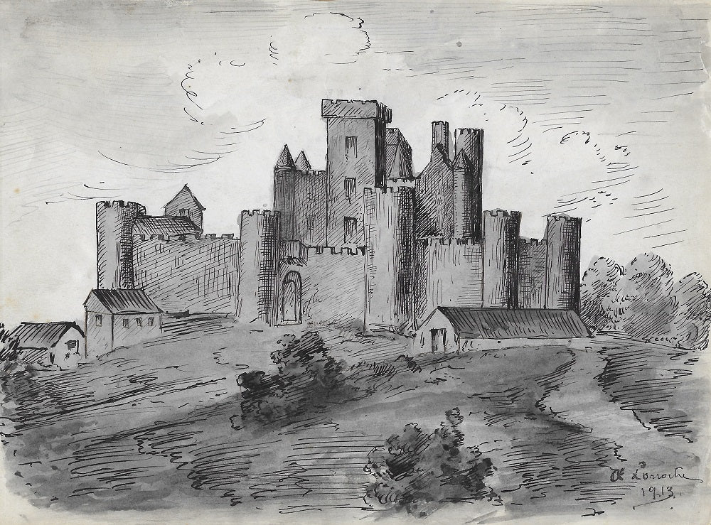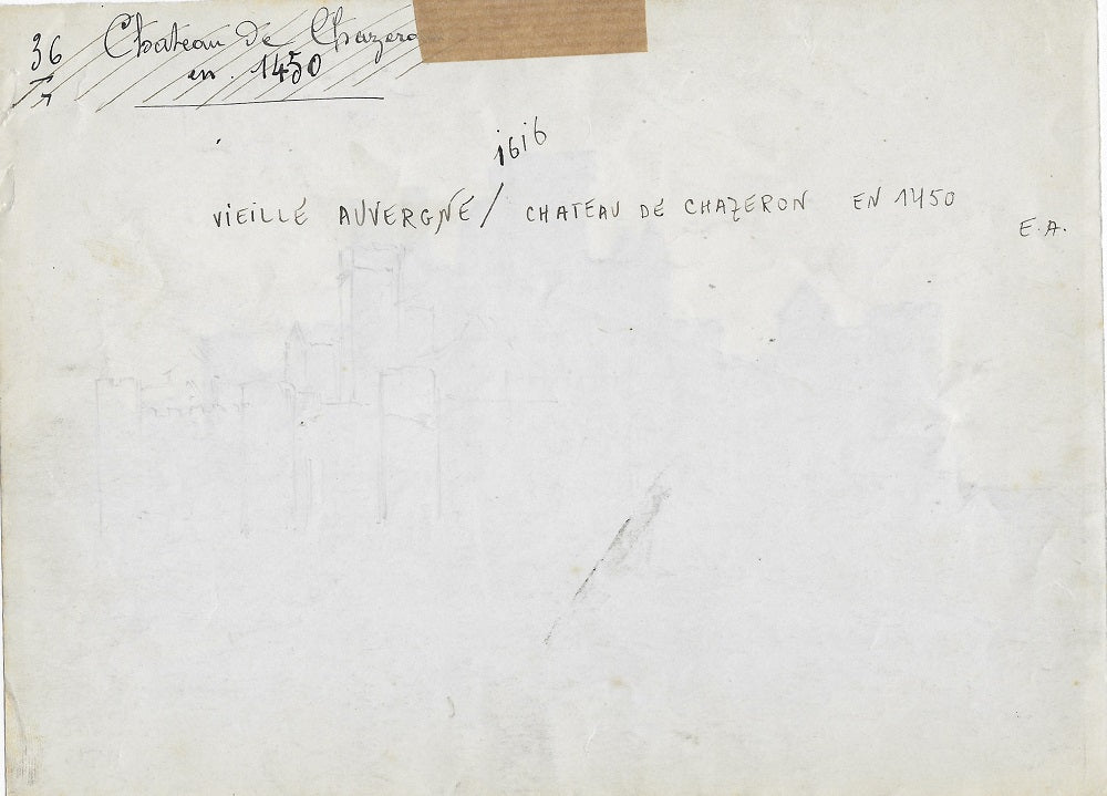 Dessin, encre et lavis par le graveur auvergnat Antonin Larroche, né à Clermont-Ferrand (Puy-de-Dôme), annoté au verso. SDbd A Larroche | 1913. Projet pour une gravure d’après une vue ancienne de ce château du XIIIe dont l’auteur n’est pas précisé mais similaire à celui de l’Armorial de Revel. Bords inégaux, papier de collage sur le bord supérieur. Dim. : 155*208 mm.