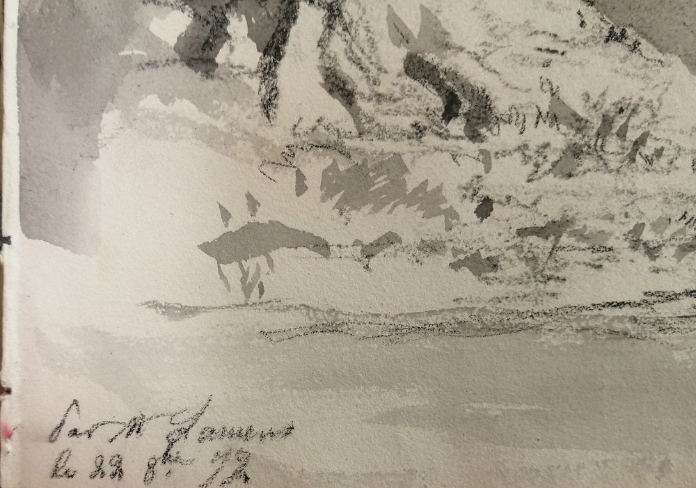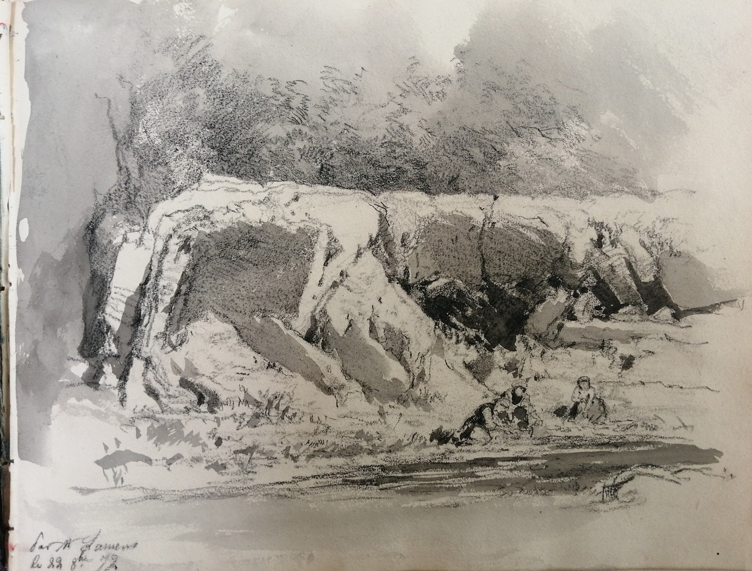 Dessin/Lavis annoté en bg Par Mr Laurens | le 22 8bre 72. Paysage animé avec trois femmes lavant le linge dans une rivière. Extrait d’un carnet à dessin, marquage à gauche de la reliure. Jean-Joseph Bonaventure Laurens (Carpentras (Vaucluse), 14 juillet 1801 † Montpellier, 28 juin 1890 ), peintre, aquarelliste, lithographe, mais aussi musicien, archéologue, géologue. 205*260 mm.