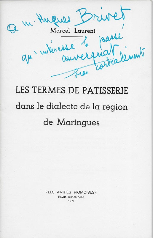 Les Termes de Pâtisserie dans le dialecte de la région de Maringues (Puy-de-Dôme, Auvergne) par Marcel Laurent, Editions des Amitiés Riomoises, 1971, 39 p. Enrichi d'un envoi de l'auteur. Ouvrage provenant de ma collection personnelle et offert par l'auteur. 20e siècle; Auvergne; Puy-de-Dôme; Folklore; Linguistique; Patois; Occitan.