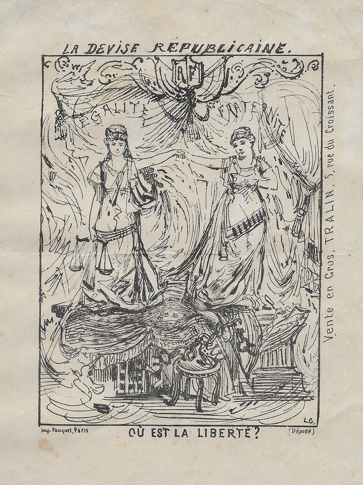 Estampe/lithographie monogrammée dans la planche en bd LC. (L. Chouquet ?). Titre indiqué hors du cadre délimitant le sujet, en haut La Devise républicaine. en bas Où est la Liberté ? Sous le sujet à g Imp Fouquet, Paris ; à d (Déposé). Sur le bord droit su sujet Vente en Gros. TRALIN, 5, rue du Croissant. Bibl. : Bdf, 16 février 1878, n°303. La feuille 174*137 mm, le sujet 128*96 mm.