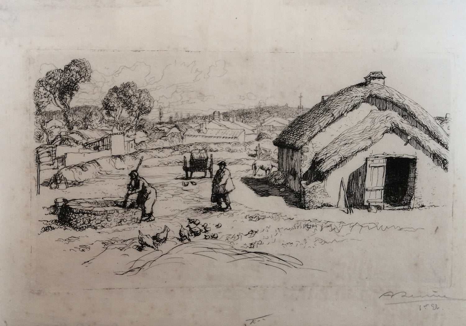 Rare eau-forte originale du premier état par Auguste Lepère (Paris, 1849 † Domme (Dordogne), 1918), Très belle épreuve sur Japon mince signée au crayon dans la cuvette en bd et annotée 1er Et. Collée sur vélin par 2 onglets sous le bord supérieur. Vue d’une ferme ou bourrine avec au premier plan à gauche 4 oies et 6 oisons, au second plan un puit sur lequel se penche une paysanne, derrière elle en retrait à droite un paysan en blouse portant un seau, au troisième une charrette et un cheval. La ferme est en bordure d’un village dont on aperçoit les toits en arrière plan avec dans le fond surélevée une croix. La feuille 167*236 mm, cuivre non coupé, au CP 120*212 mm.