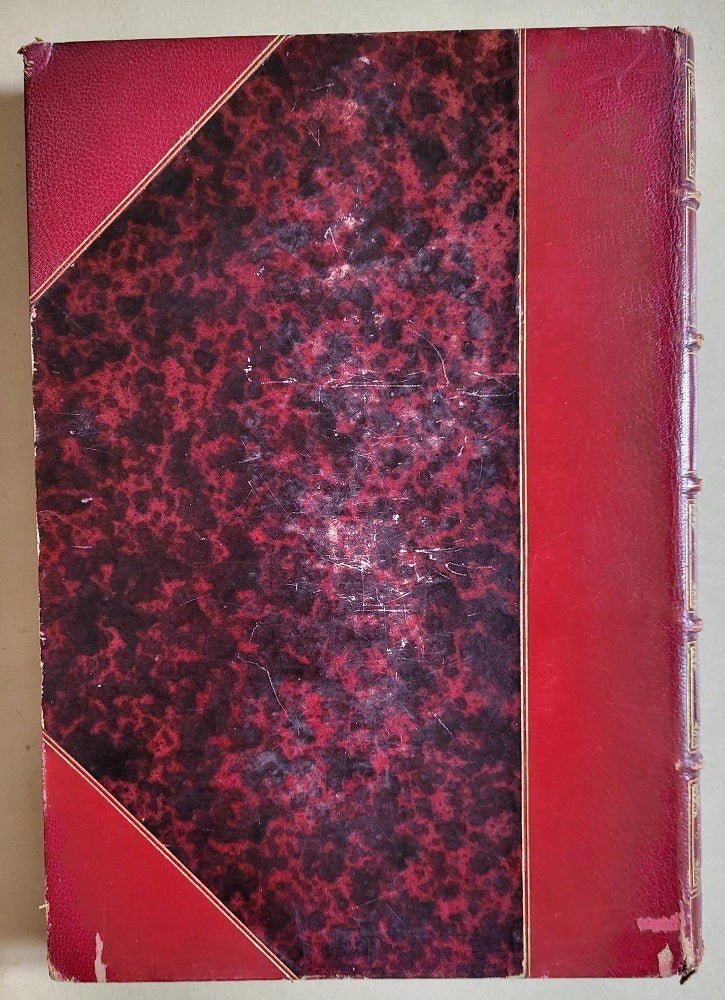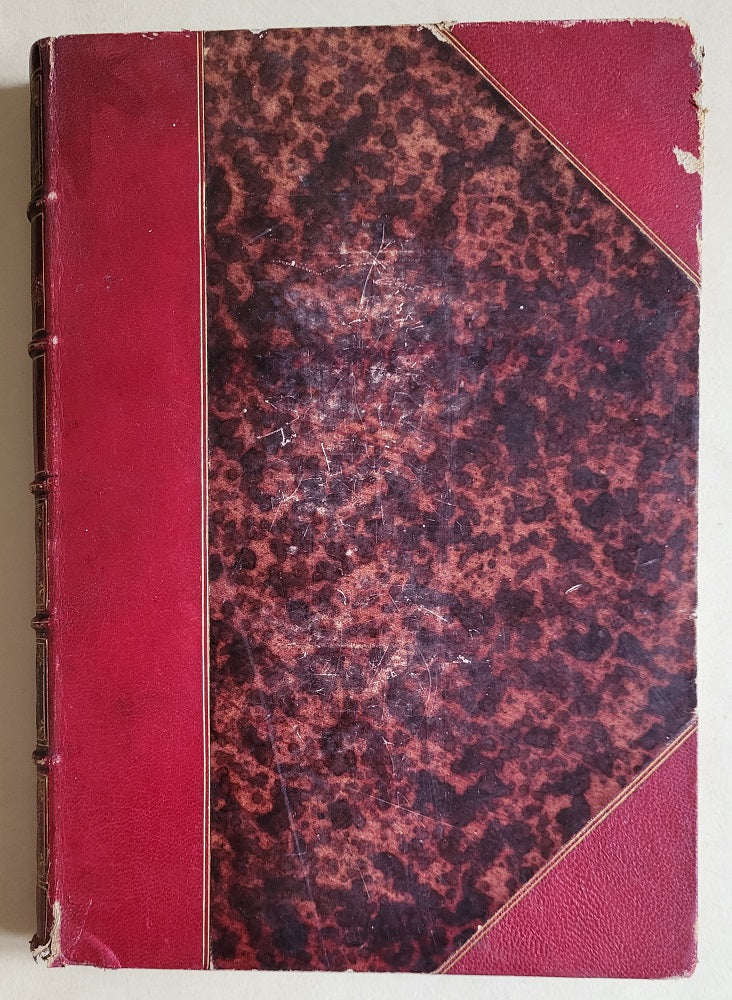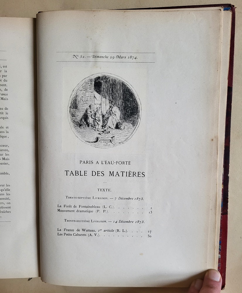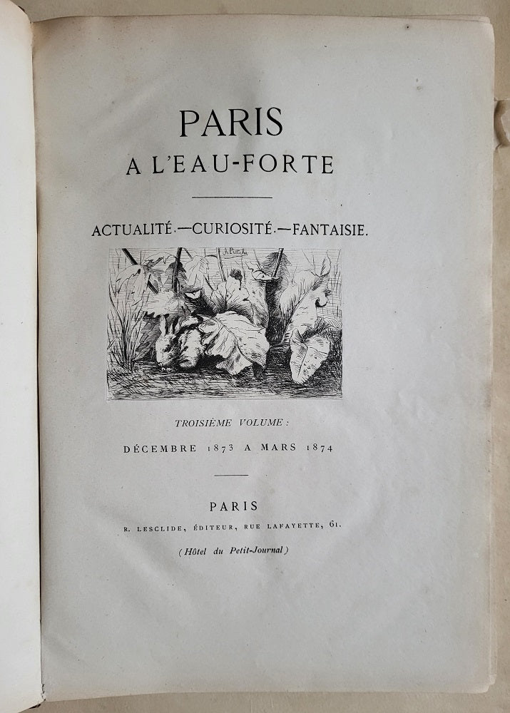 PARIS A L'EAU-FORTE : Journal, d'actualité, de curiosité et de fantaisie illustré d'eaux fortes fondé par Richard Lesclide, secrétaire de Victor Hugo. De Décembre 1873 à Mars 1874. Complet des quinze livraisons (n°37 au n°51) et de la 16ème (n°52, tables des Matières et des gravures). Environ 118 estampes tirées par Ch. Delâtre sans les frontispices et culs-de-lampe. Gravures à l'eau-forte par Jules Adeline, Benassit, Breton, le graveur cantalien Jean-Louis Charbonne (RARE), Cordier, Courtry, Paul Fournier, Gery, les premières eaux fortes d'Armand Guillaumin (RARE), Félix Oudart, Protche, Van Ryssel (RARES gravures du dr Gachet) ... . 270 p. Reliure demi cuir rouge en état d'usage, dos 5 nerfs, titre doré, intérieur TBE. Bibl. : Béraldi, Vol. 9, 1891, p.180-181, n°1 « Les trois premiers volumes (année 1873-74) ont seuls quelque intérêt ».